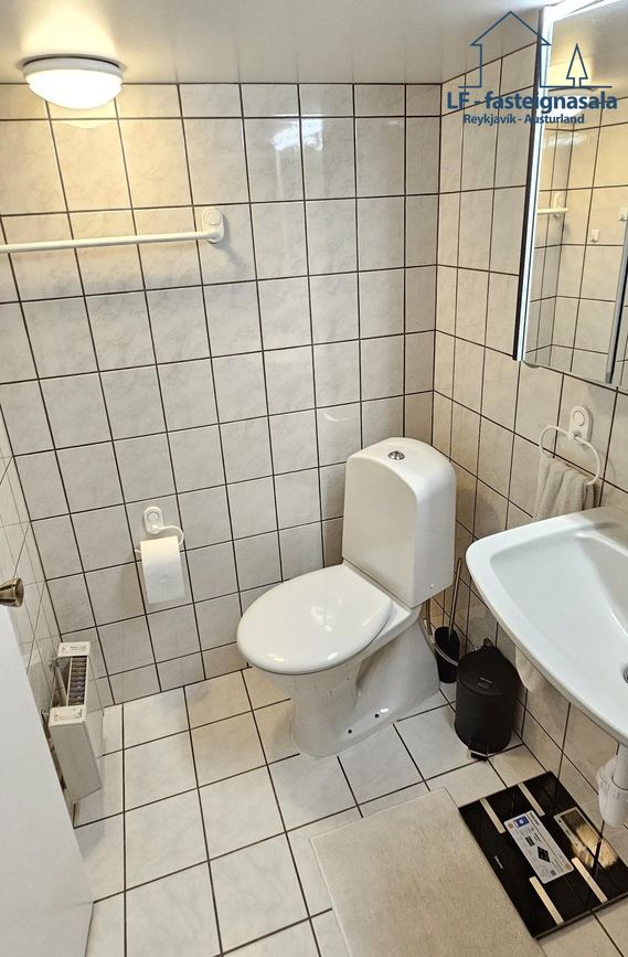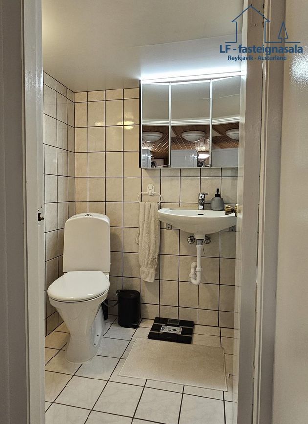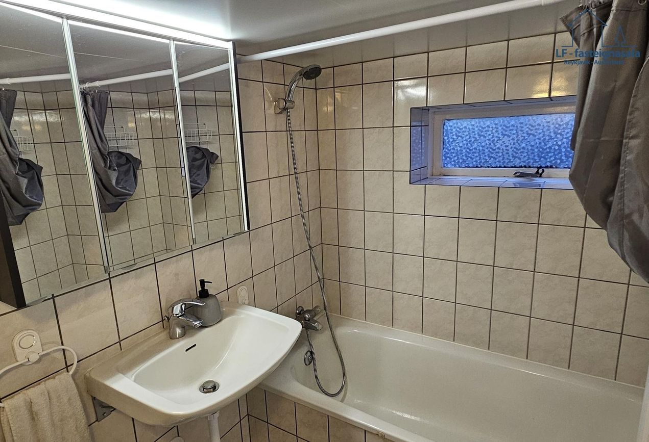 Baðherbergi er í kjallaranum og er það flísalagt og með baðkari.