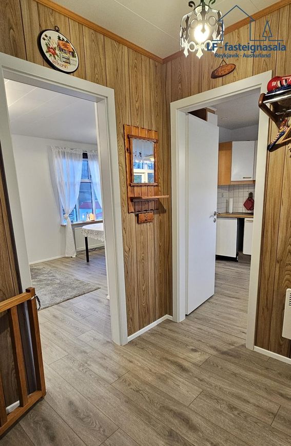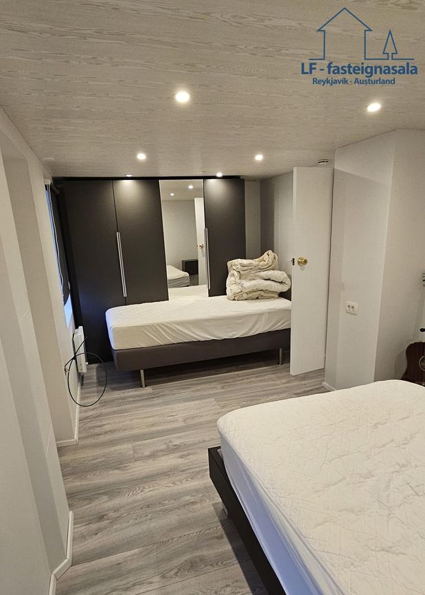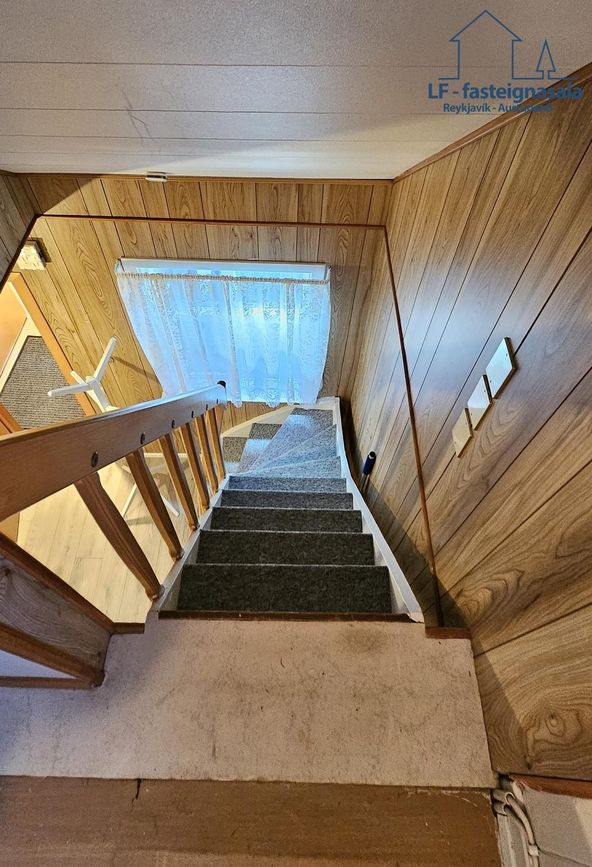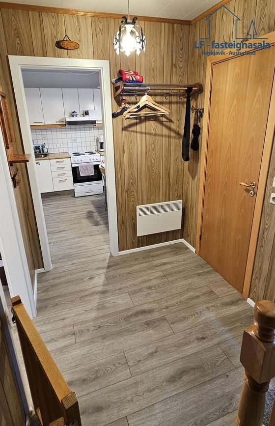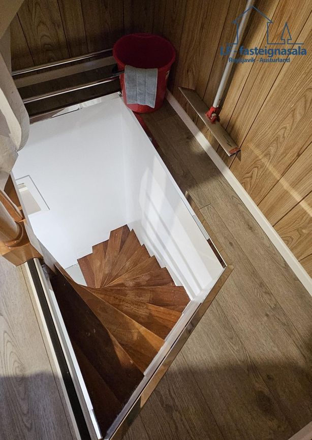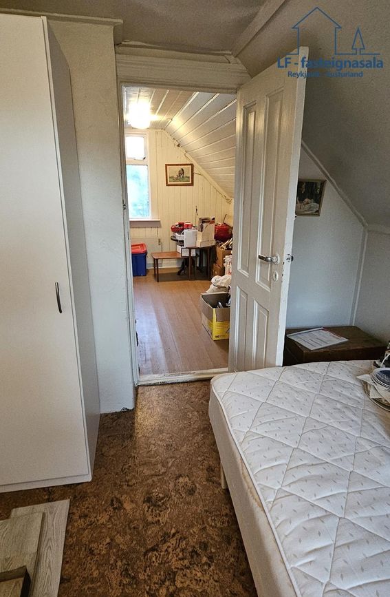 Stigi er frá ganginum upp í rishæð þar sem eru 2 svefnherbergi og þarf að ganga í gegn um annað herbergið til að komast í hitt.