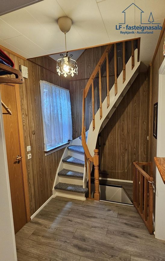 Úr forstofunni er komið inn á gang, þaðan er stigi niður í kjallarann og upp í risið.