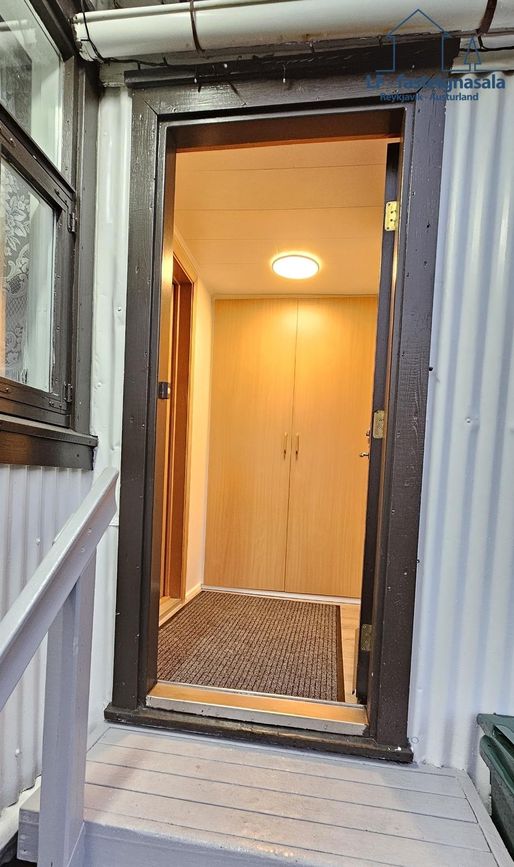Gengið er inn á miðhæð hússins.