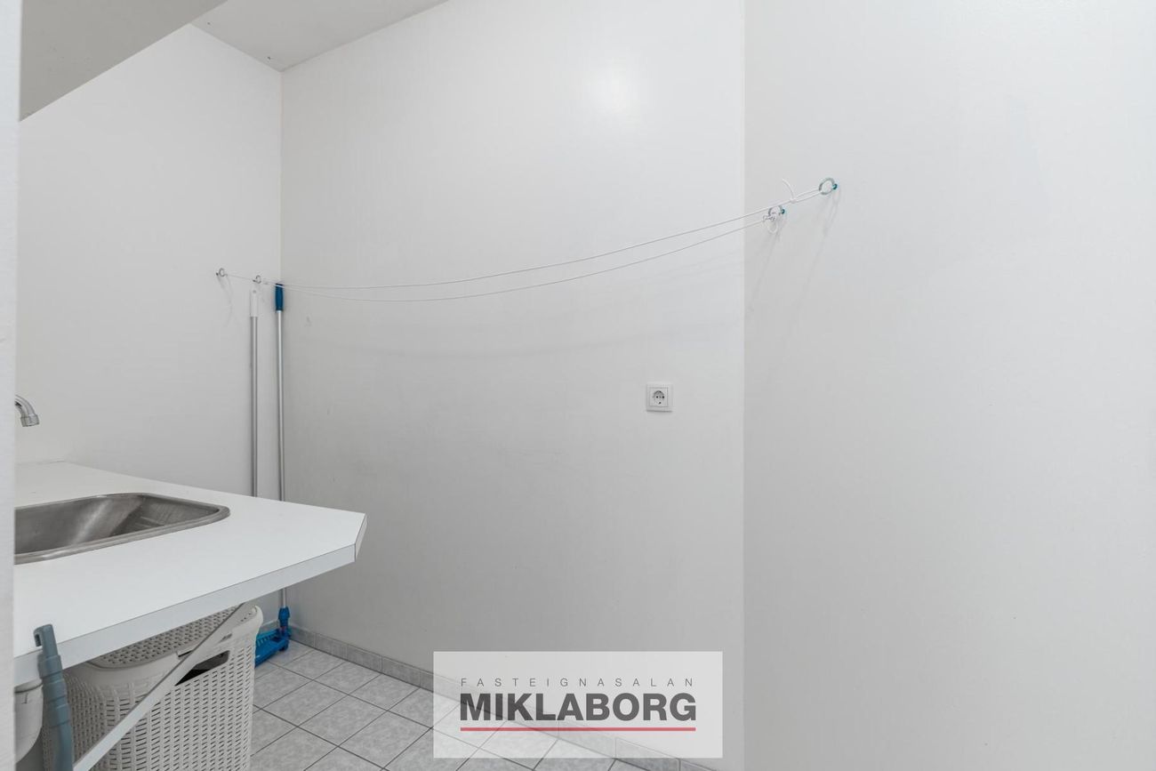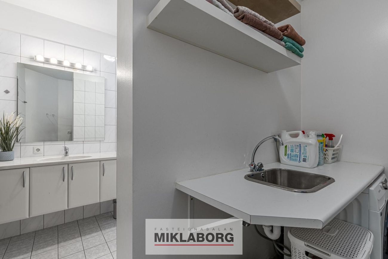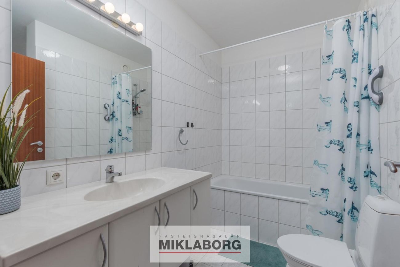 Baðherbergið er flísalagt, hvít innrétting og baðkar með sturtuaðstöðu. Inn af baðherbergi er gott flísalagt þvottahús í sérrými.