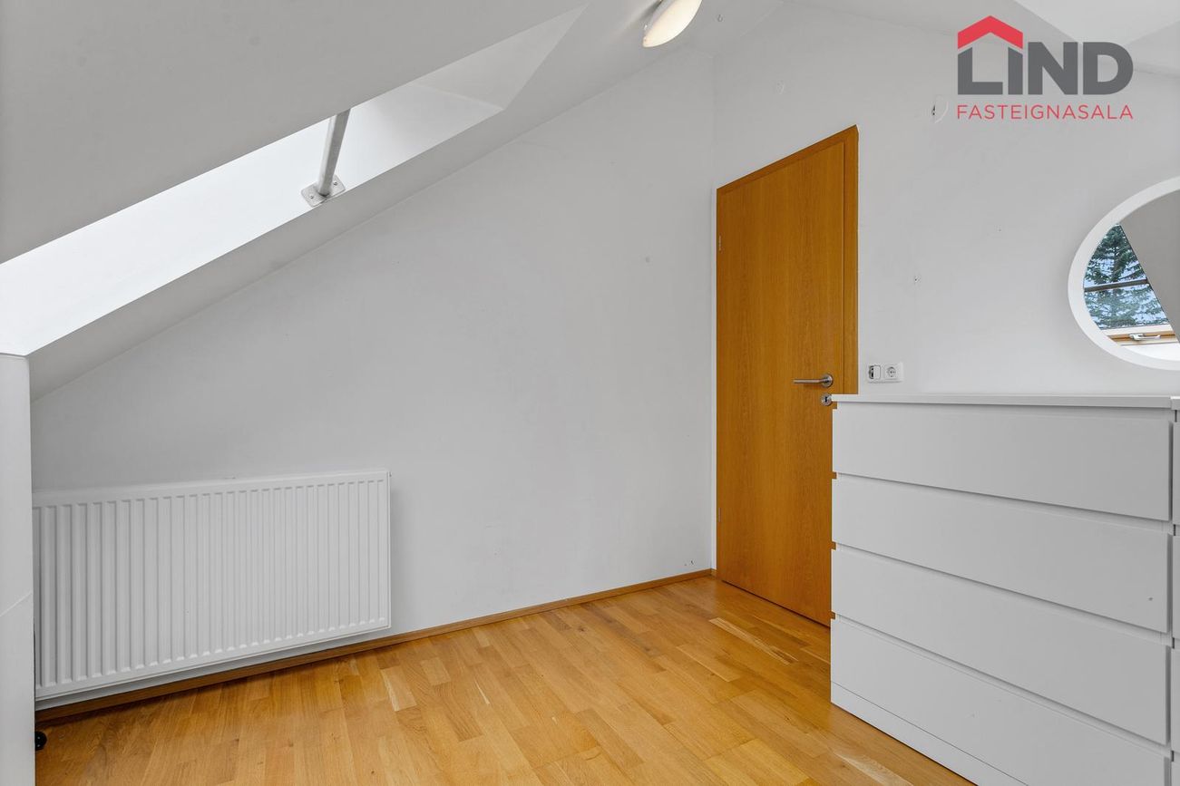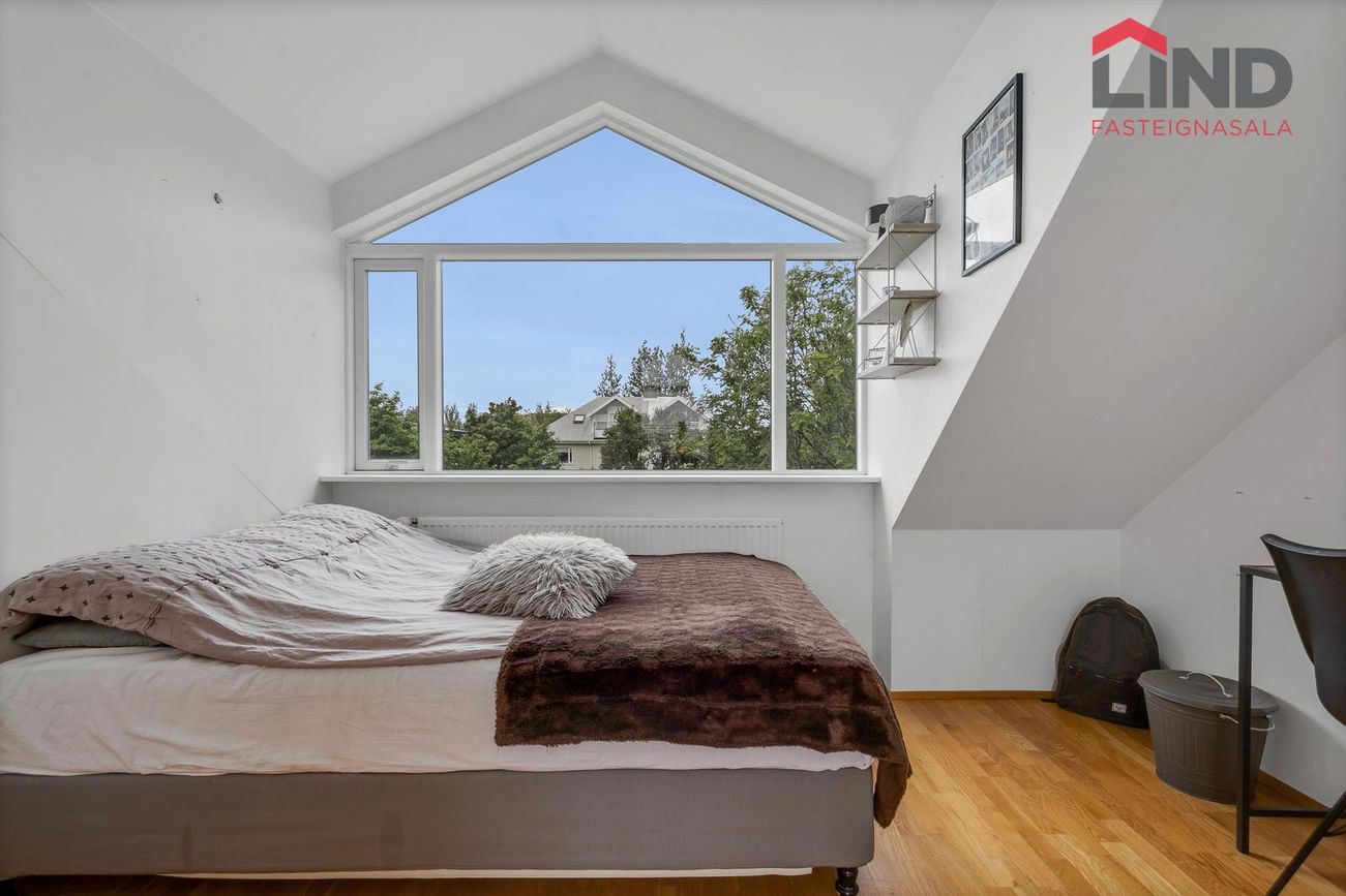 Fjögur svefnherbergi með parketgólfi. Eitt herbergi á rishæð var áður baðherbergi og hægt að breyta aftur.