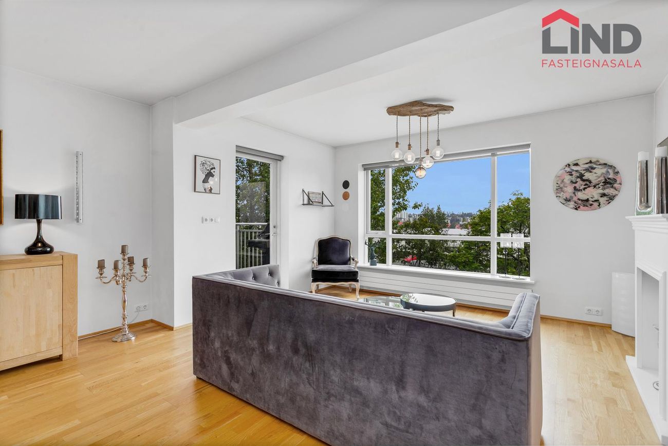 Björt og rúmgóð stofa með parketgólfi og útgangi á svalir.