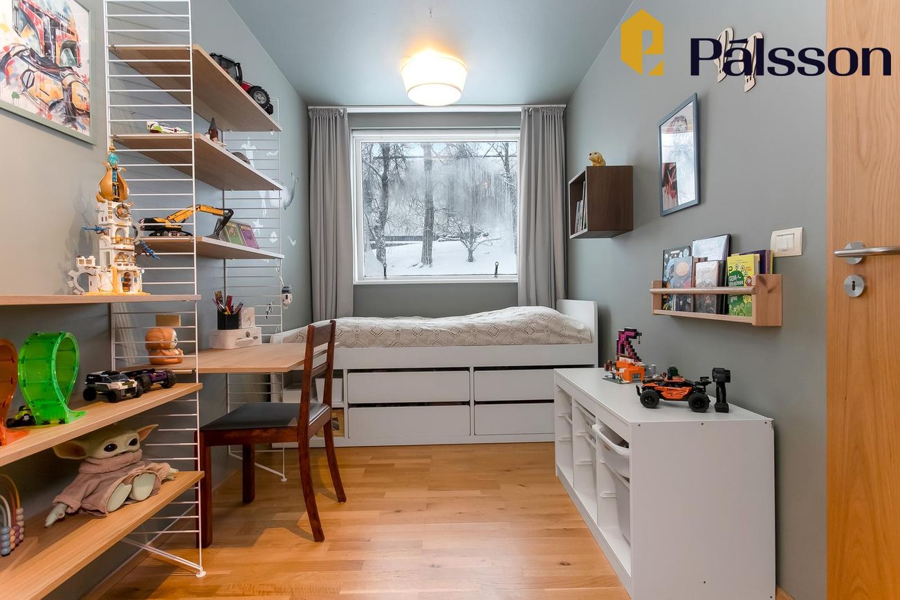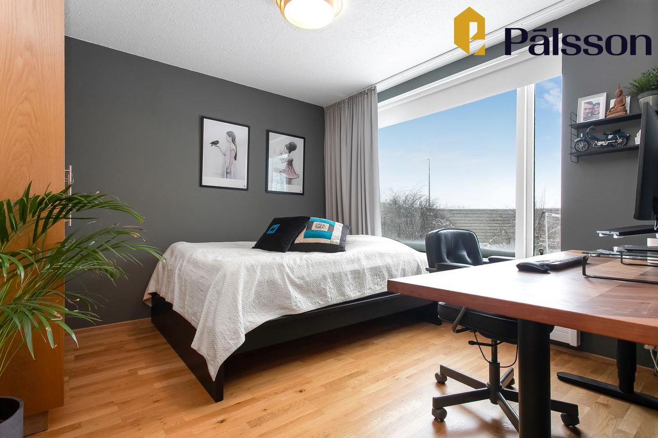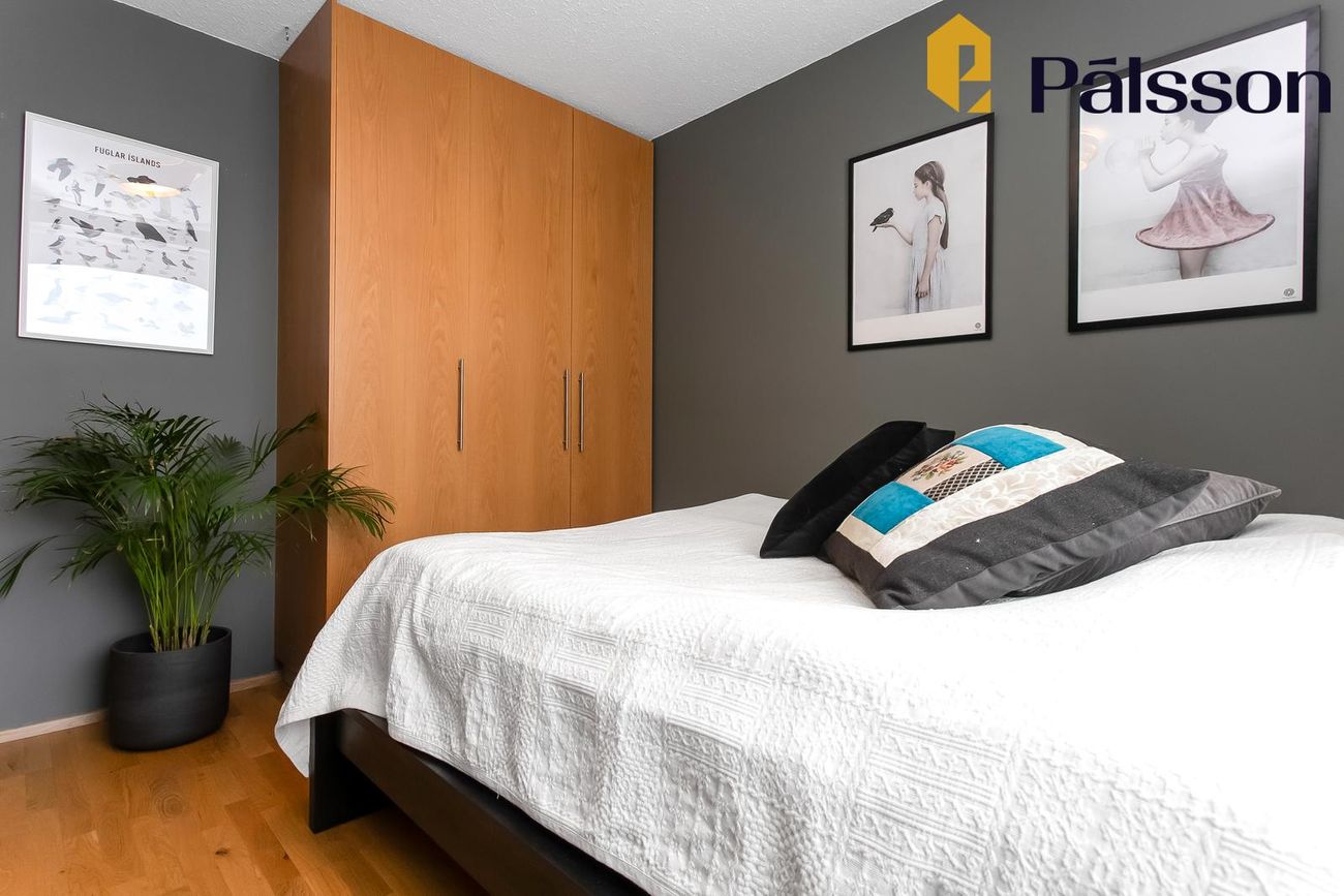 Hjónaherbergi og barnaherbergi með parketgólfi og fataskápum. Eitt herbergi með útgöngu út í garð.