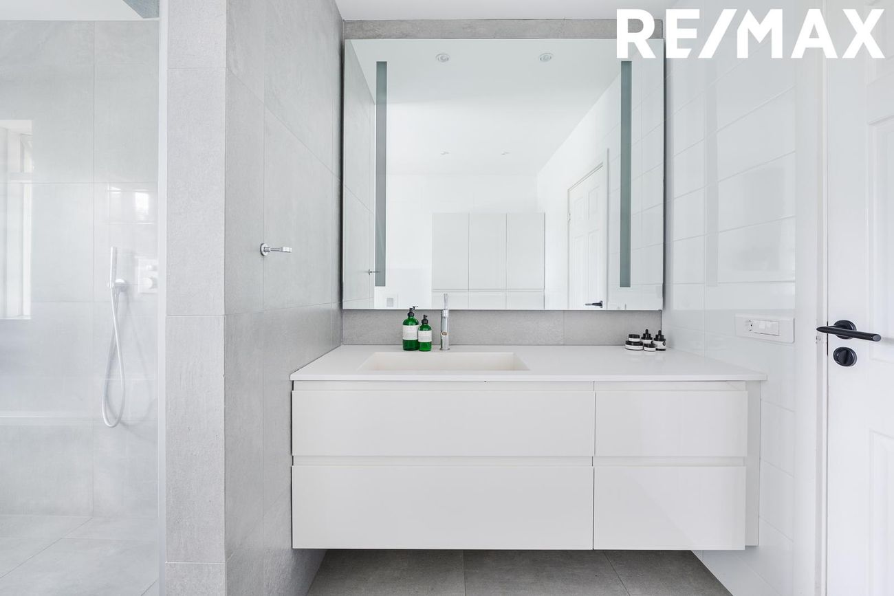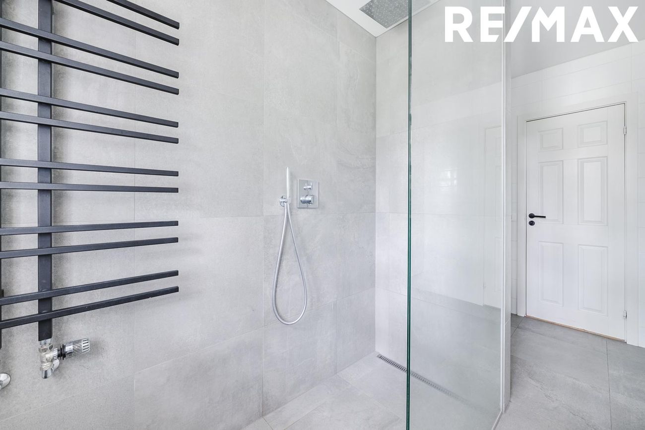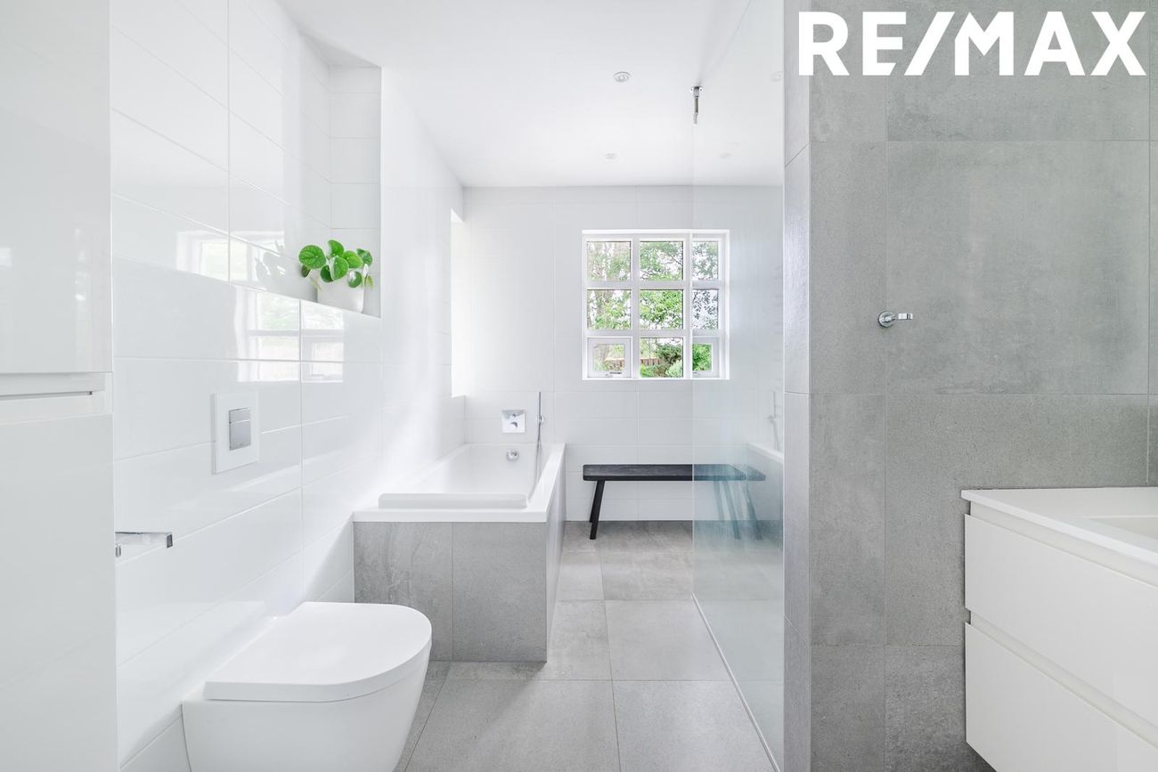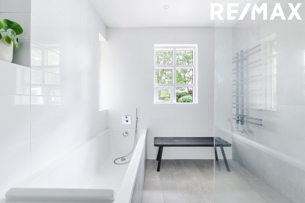 Endurnýjað baðherbergi með flísalögðum veggjum og gólfi, handlaug, sturtu og baðkari.