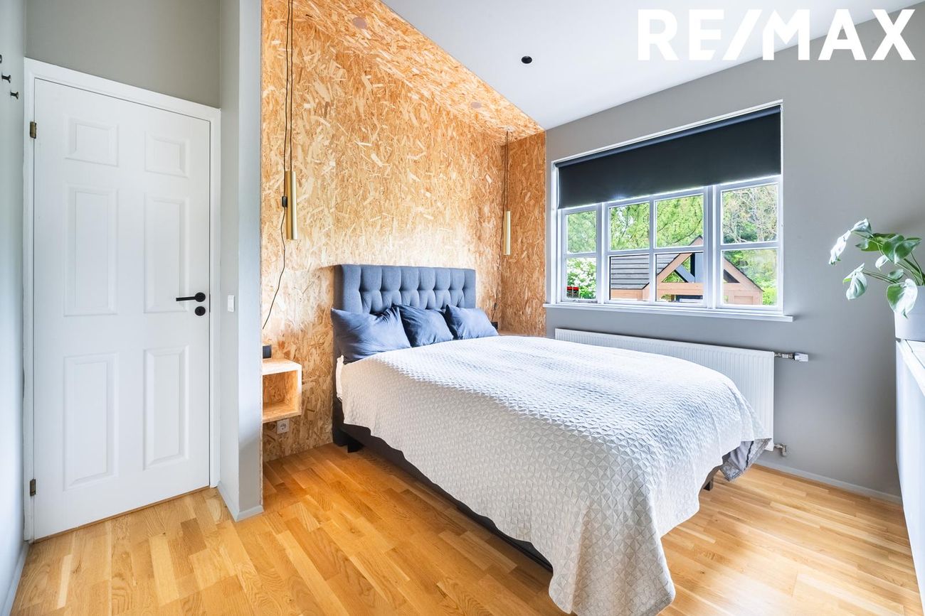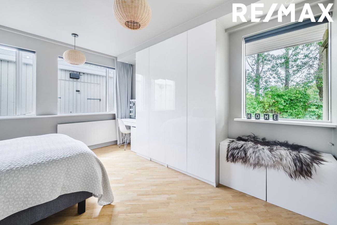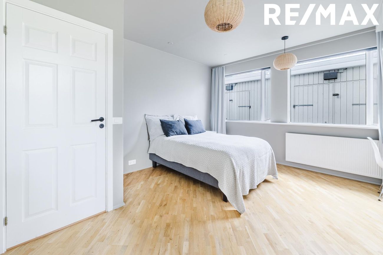 Svefnherbergi með parketgólfi og fataskápum. Eitt herbergi notað sem bílskúr með gólfhita.