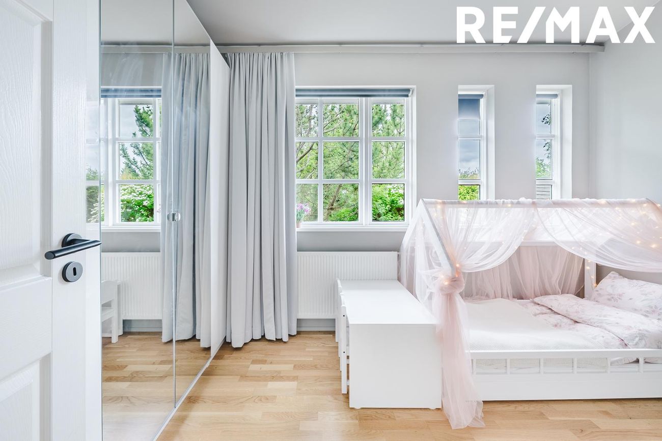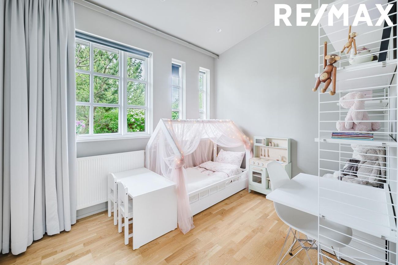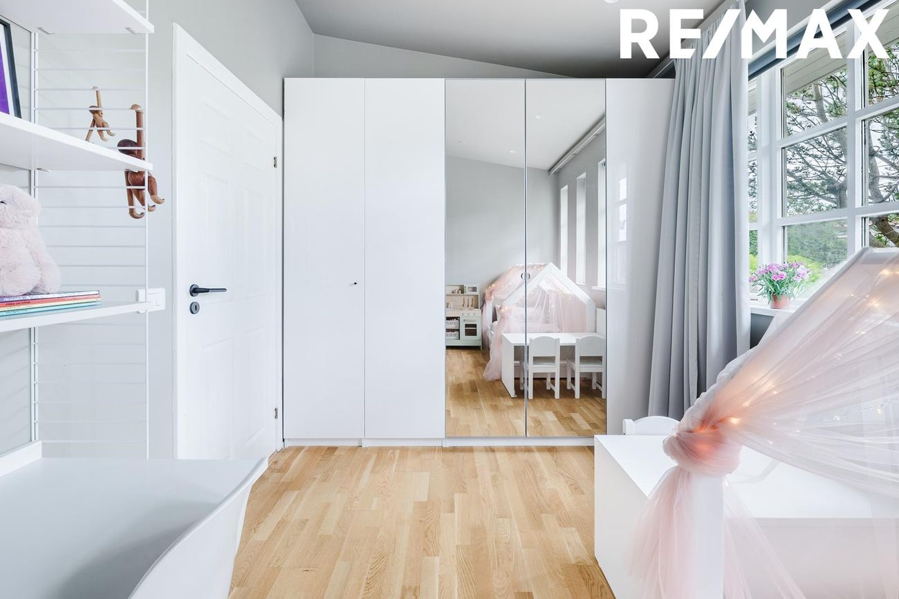 Svefnherbergi með parketgólfi og fataskápum. Eitt herbergi notað sem bílskúr með gólfhita.