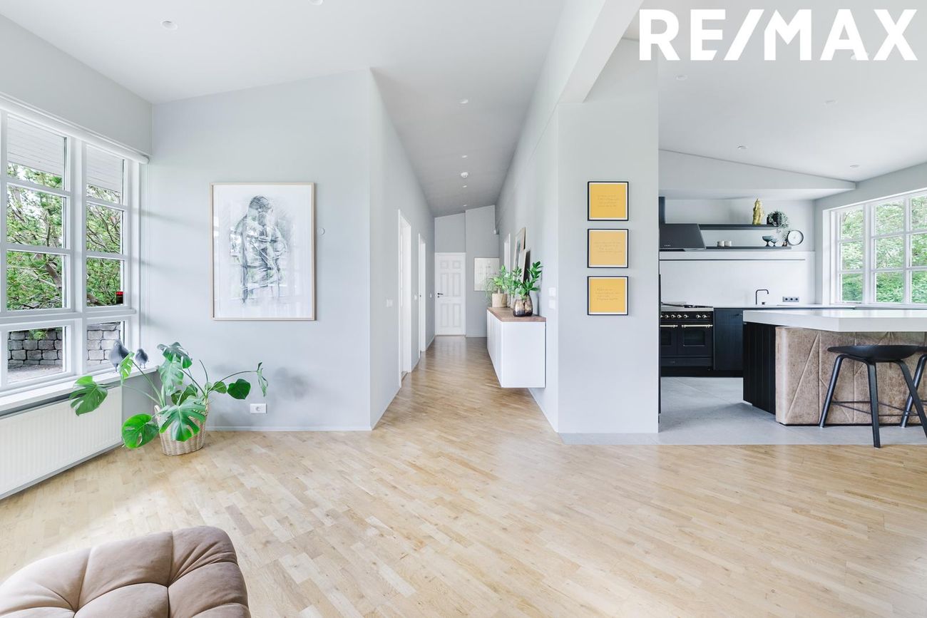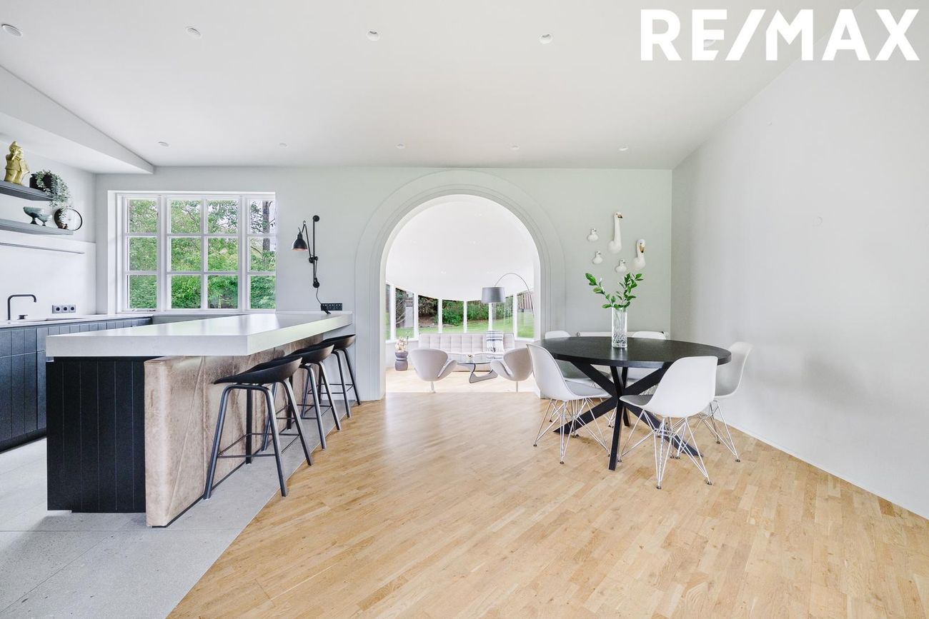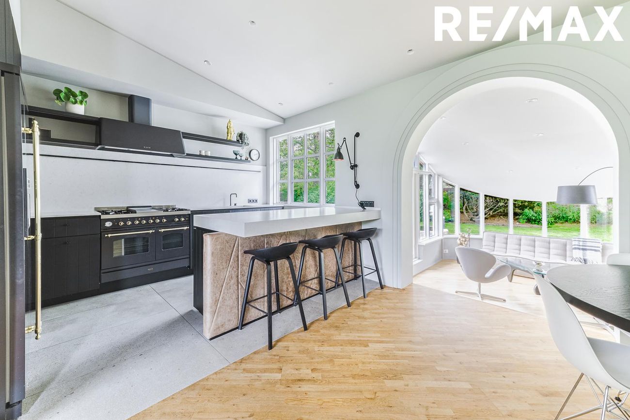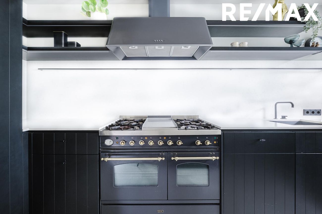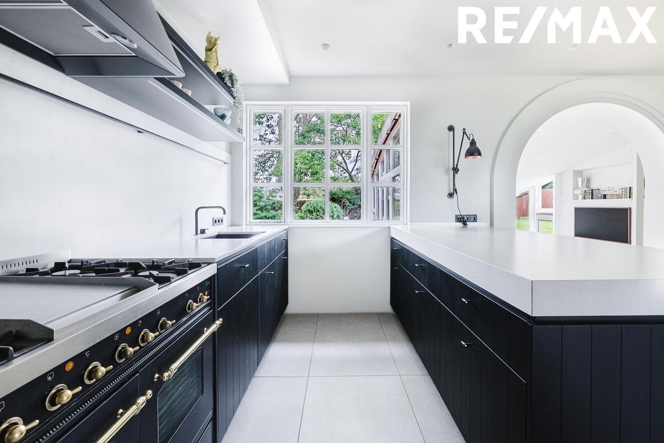 Endurnýjað eldhús með innbyggðri uppþvottavél, tvöföldum ísskáp, tveimur ofnum, gaseldavél og háfur. Flísalagt gólf með gólfhita.