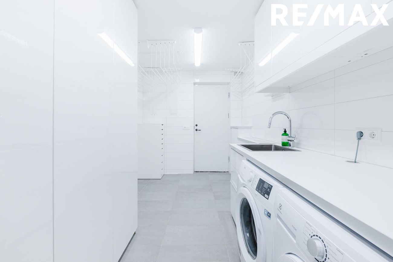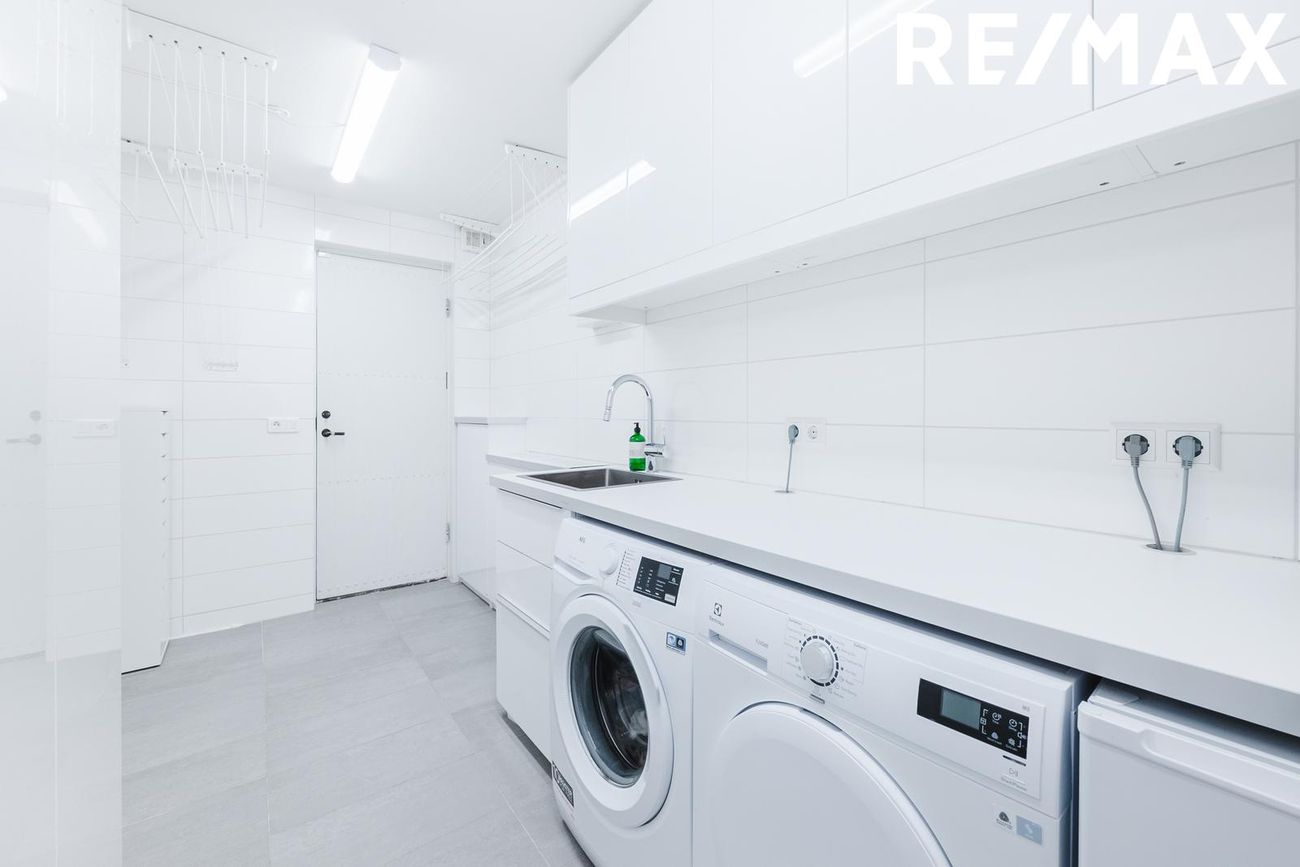 Þvottahús með flísalögðu gólfi, vaski, vinnuborði og útgöngu að svalahurð.