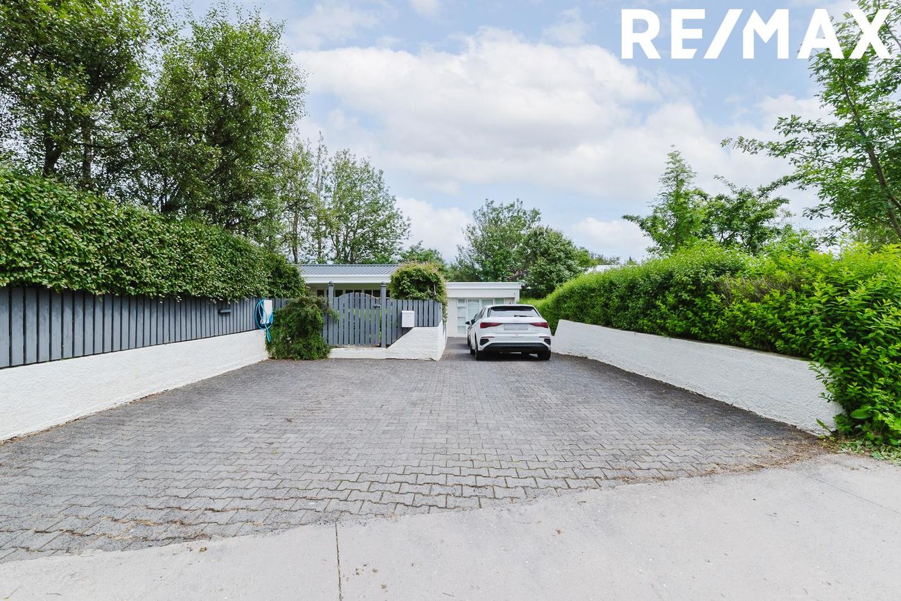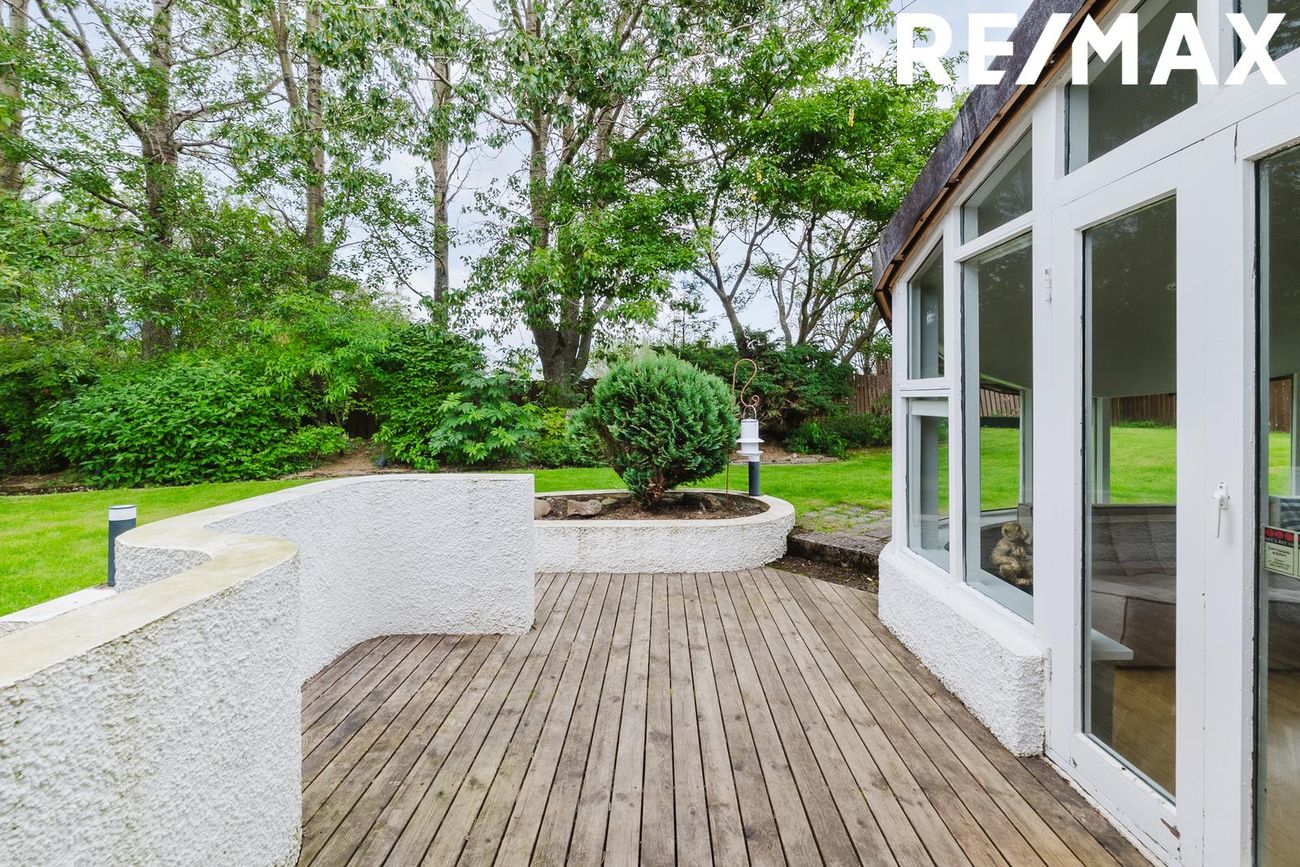 Grónn og vel viðhaldin garður með timburvernd suðvestan og norðaustan við hús. Philips Hue lýsing í garði.