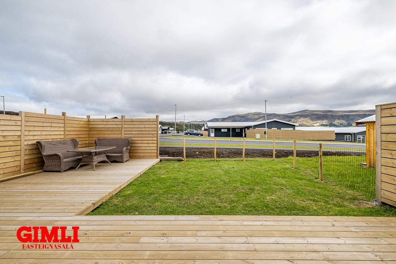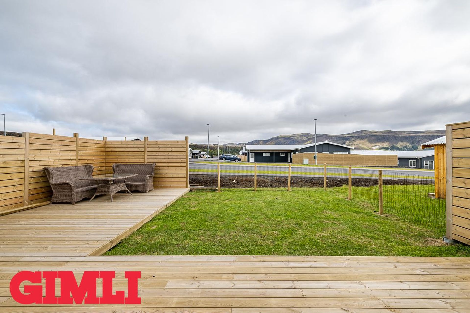 Garður: Fyrir fram hús er stórt rúmgott bílastæði. Fyrir aftan hús er afgirt verönd ásamt grasbletti.