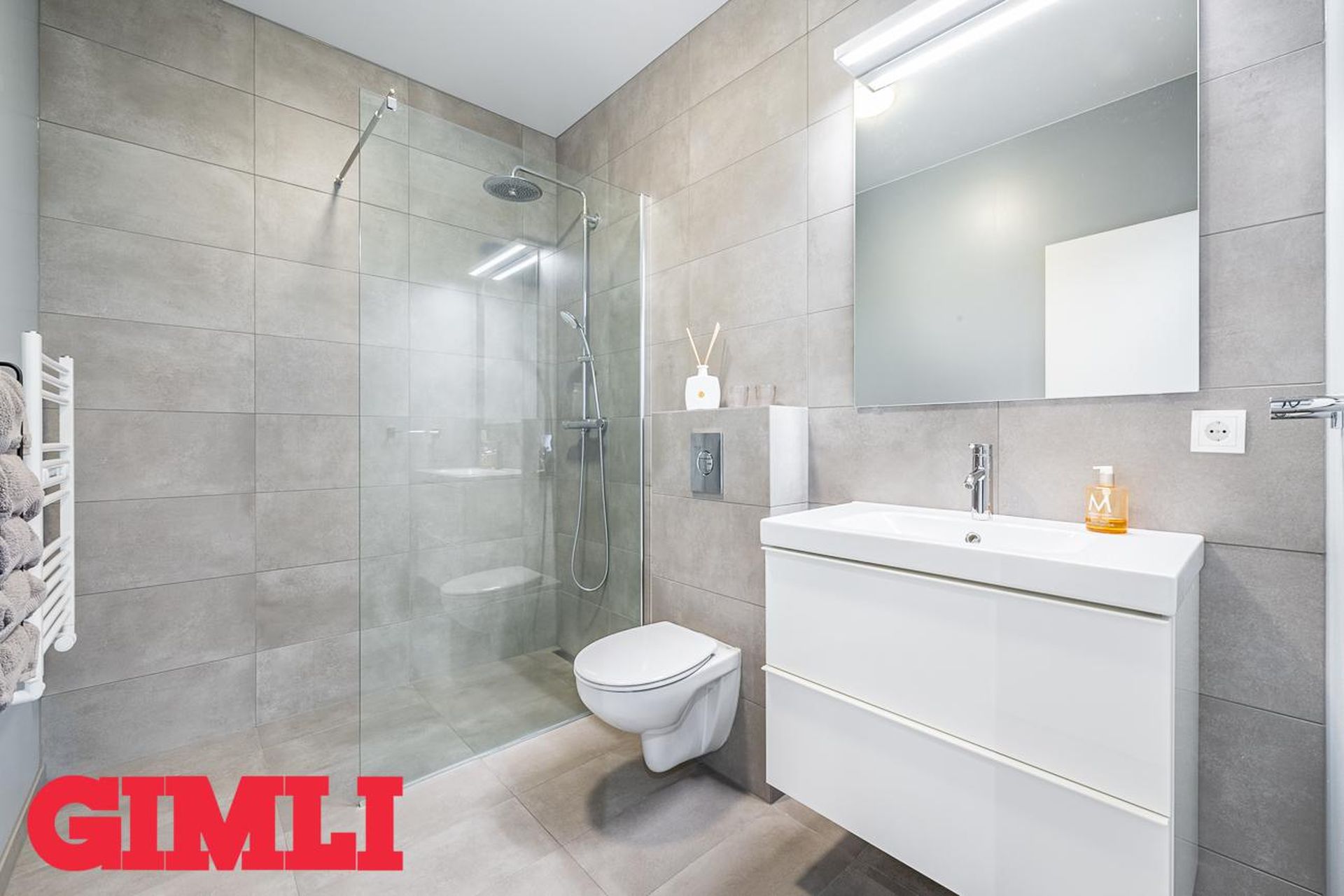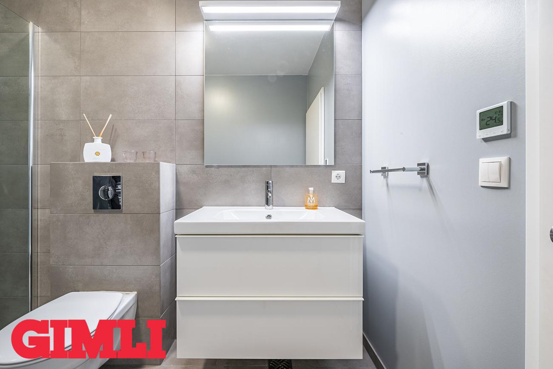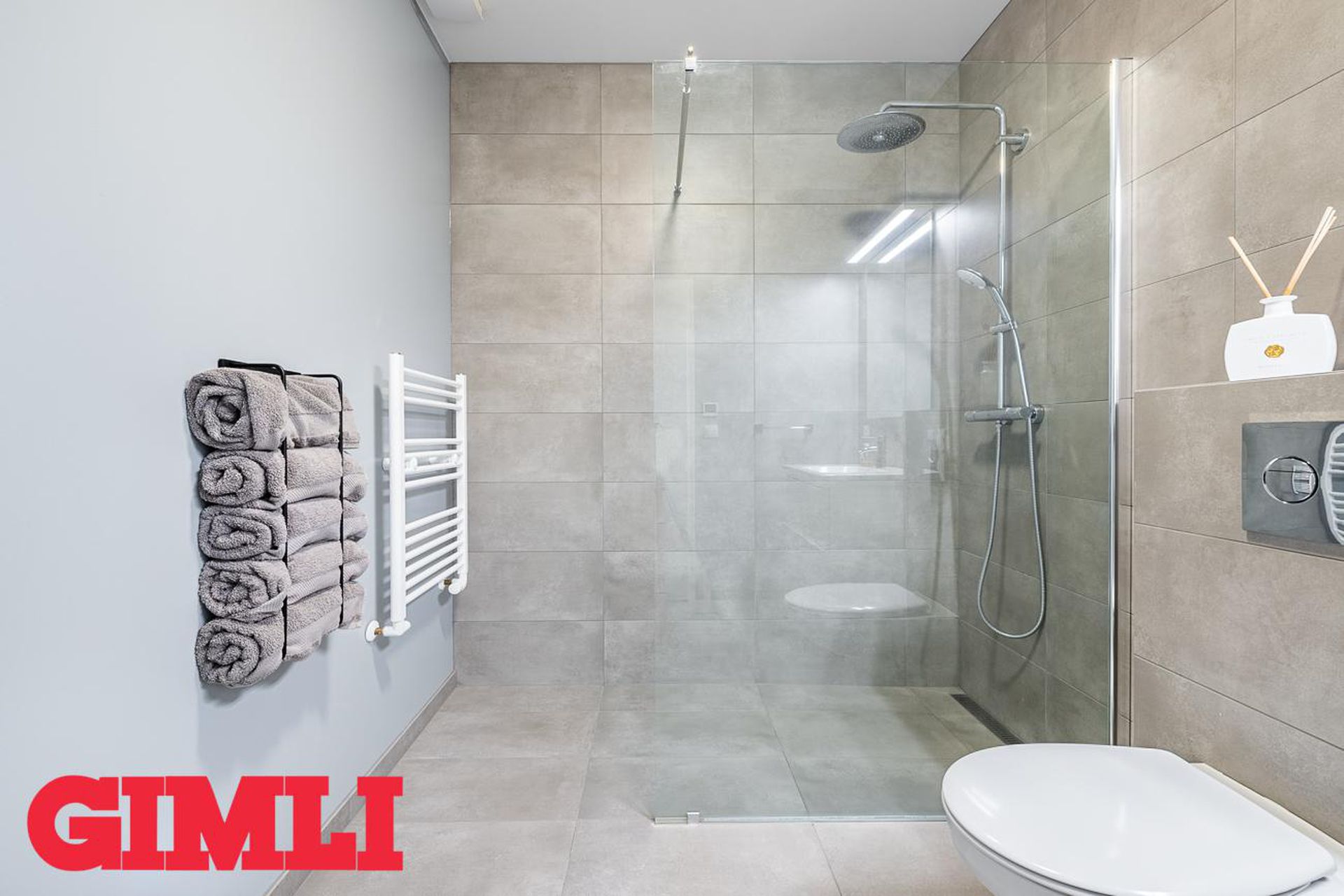 Baðherbergi: Flísalagt gólf og veggir að hluta. Sturtugler, upphengd baðinnrétting með spegli, upphengt klósett og handklæðaofn.