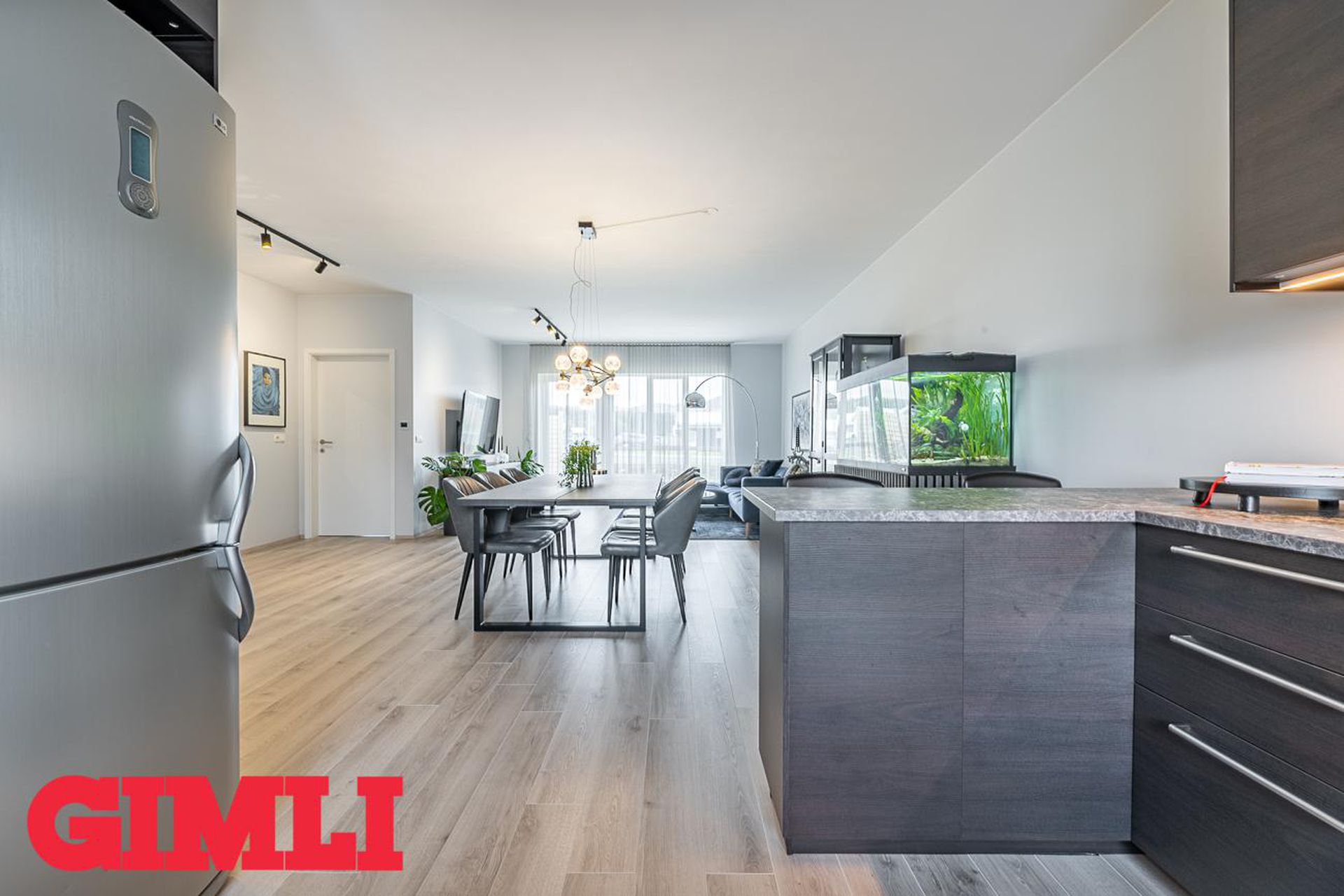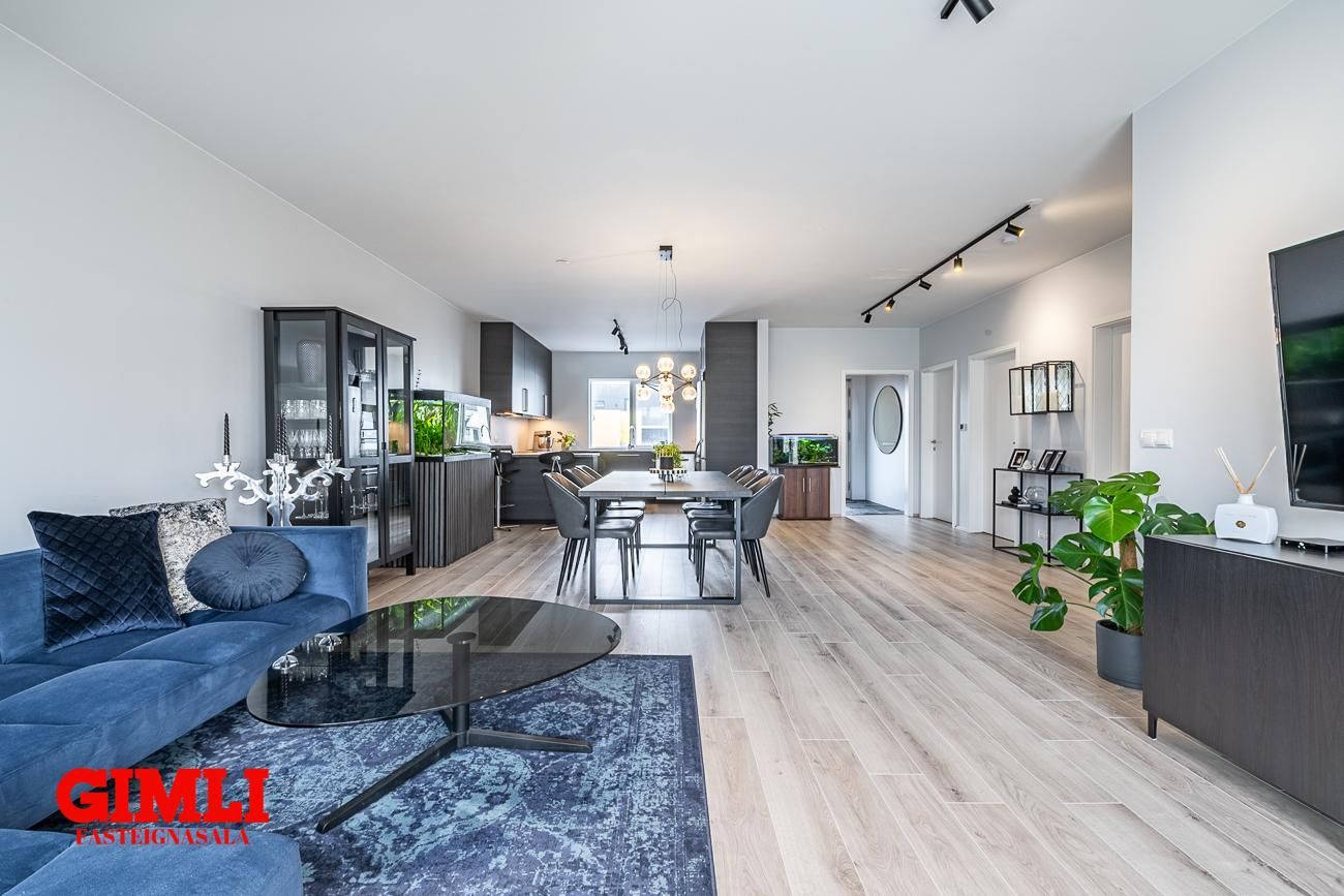 Stofa / Borðstofa: Rúmgóð stofa í opnu rými með eldhúsi, harðparket á gólfi, og útgengt út á verönd.