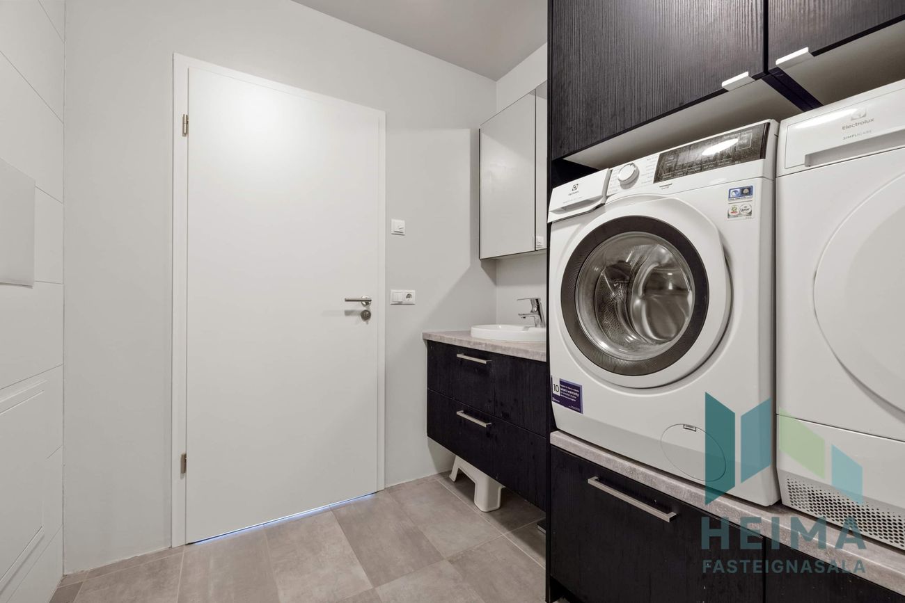 einnig er mjög rúmgóð innrétting með miklu geymsluplássi þar sem gert er ráð fyrir þurrkara og þvottavél í vinnuhæð, flísar á gólfi og hluta til á veggjum. Handklæðaofn og rúmgóð sturta.