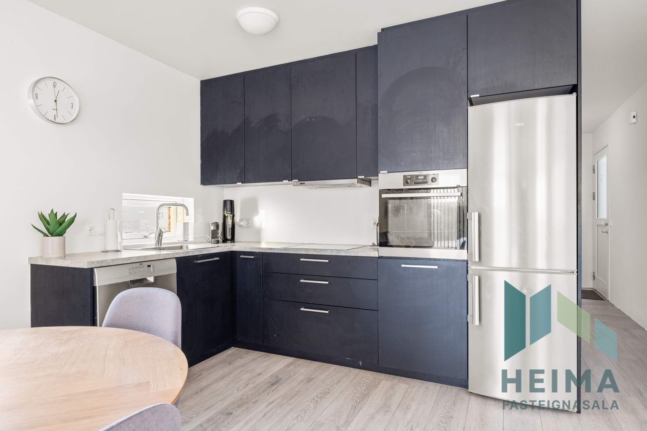 er opið inn í stofu með fallegri dökkri innréttingu með ljúflokunum þar sem gert er ráð fyrir ísskáp og uppþvottavél í innréttingu, AEG ofn í vinnuhæð, AEG keramik helluborð með viftu yfir. Harðparket á gólfi.
