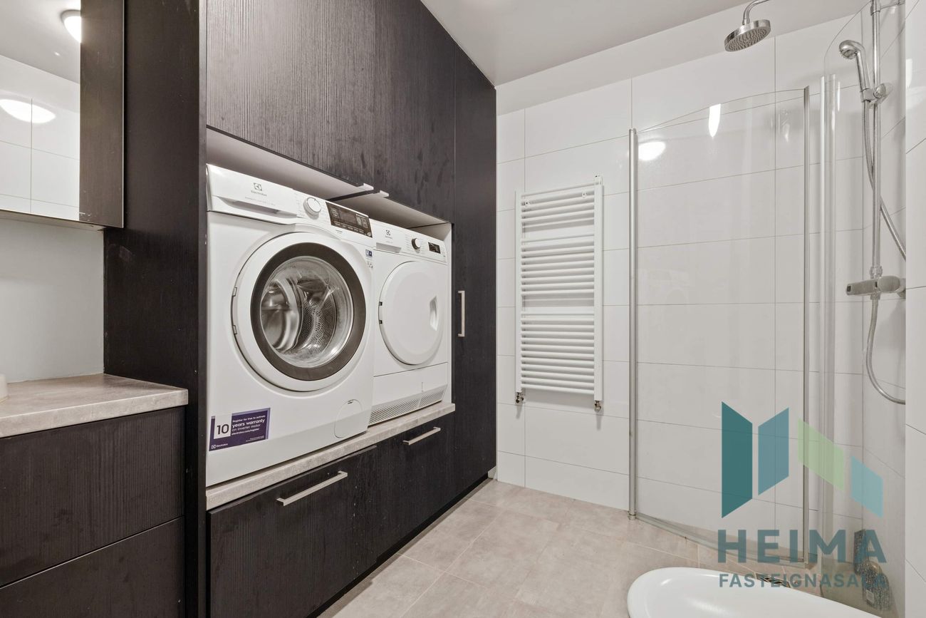 einnig er mjög rúmgóð innrétting með miklu geymsluplássi þar sem gert er ráð fyrir þurrkara og þvottavél í vinnuhæð, flísar á gólfi og hluta til á veggjum. Handklæðaofn og rúmgóð sturta.