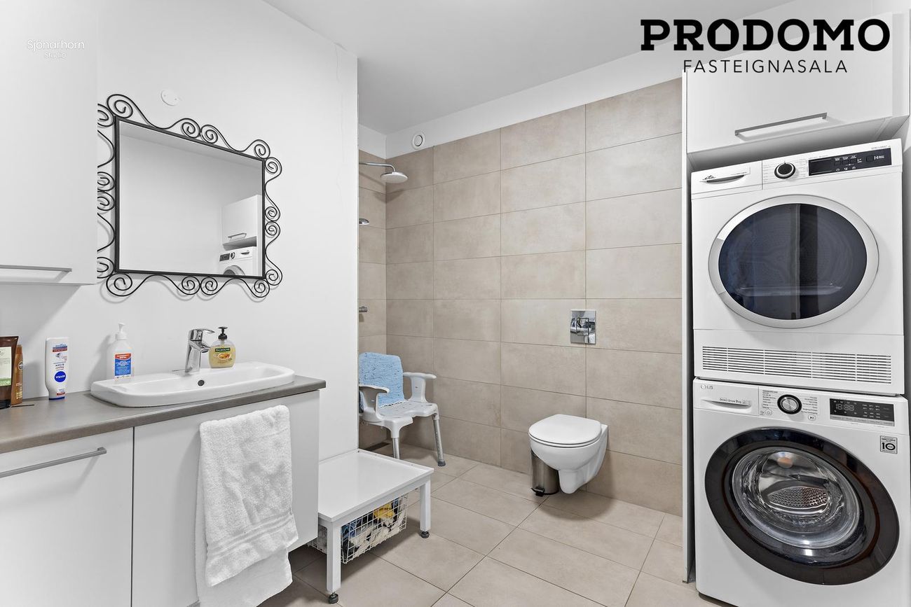 Baðherbergi hefur flísar á góli og veggjum að hluta innréttingu við vask, sturtu, upphengt salerni, handklæðaofn, aðstöðu fyrir þvottavél og þurrkara.