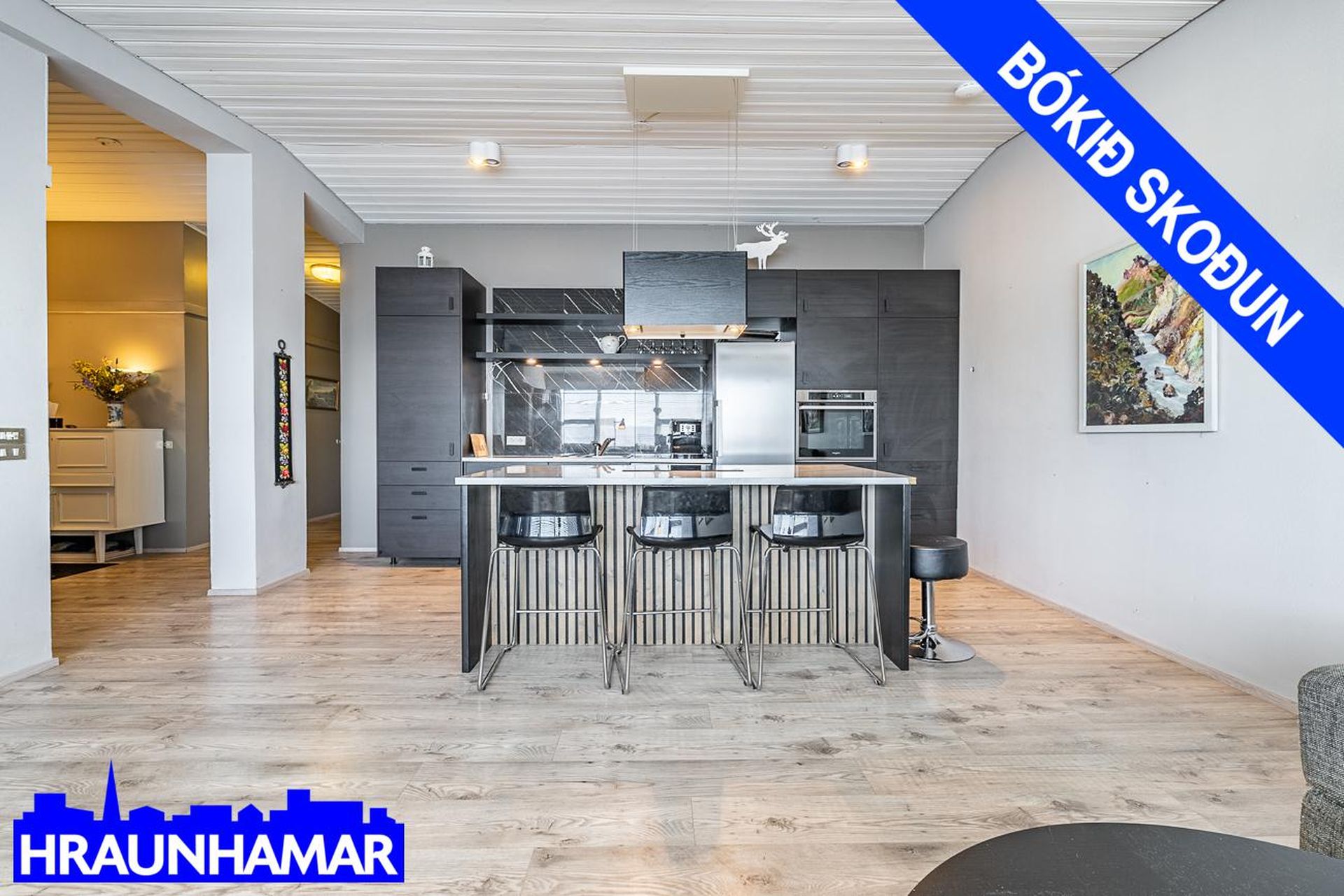 Hraunhamar fasteignasala kynnir: Rúmgóða og fallega 116,5 fm 4ra herbergja íbúð á 3. hæð(efstu) í verslunar og íbúðarhúsi við Dalshraun 5, Hafnarfirði. Staðsetning er góð, stutt í alla þjónustu ofl. suð-vestur svalir. Lýsing eignar:Forstofa með skáp.Rúmgott hol. Stórt og bjart alrými þar sem eldhús er opið inn í stofu. Nýleg eldhúsinnrétting með rúmgóðri eyju. Útgengt frá stofu út á stórar sólríkar svalir. Þrjú mjög rúmgóð svefnherbergi. Eitt með fataherbergi inn af þar sem er handlaug. Flísalagt baðherbergi með upphengdu salerni, innréttingu og baðkari með sturtuaðstöðu í. Nýleg gólfefni. Harðparket. Hátt til lofts í íbúðinni. Þvottahús með innréttingu. Geymsla er innan íbúðar.Búið er að breyta íbúðinni frá upprunalegum teikningum. Eldhús fært í alrými og bætt við þriðja svefnherberginu. Góð sameign, hús virðist í all þokkalegu ástandi að utan. Góð staðsetning miðsvæðis. Góðar svalir. Fasteignamat næsta 2024 er 65.800.000 kr. Nánari uppl. gefur Glódís Helgadóttir í s. 659-0510 eða á netfangið og Helgi Jón Harðarson sölustjóri í s. 893-2233 eða Skoðunarskylda: Í lögum um fasteignakaup nr. 40/2002 er kveðið á um ríka skoðunarskyldu kaupenda á fasteignum. Hraunhamar fasteignasala vill benda væntanlegum kaupendum á að kynna sér vel ástand fasteigna fyrir kauptilboðsgerð og ef þurfa þykir að leita til sérfræðinga fyrir nánari ástandsskoðun.Gjöld sem kaupandi þarf að standa straum af vegna kaupanna:1. Stimpilgjald af kaupsamningi, fyrstu kaup (0,4%), almenn kaup (0,8%), lögaðilar (1,6%) af heildarfasteignamati.2. Þinglýsingargjald af kaupsamningi, veðskuldabréfi, mögulegu veðleyfi o.fl. – kr. 2.700 kr. af hverju skjali.3. Lántökugjald lánastofnunar er skv. verðskrá viðkomandi lánastofnunar.4. Umsýslugjald til fasteignasölu skv. þjónustusamningi Hraunhamar er elsta fasteignasala Hafnarfjarðar, stofnuð 1983 og fagnar því 40 ára afmæli á árinu 2023. Hraunhamar, í fararbroddi í 40 ár. – Hraunhamar.is