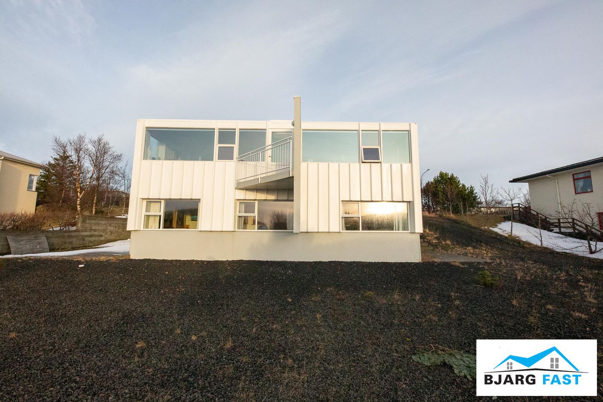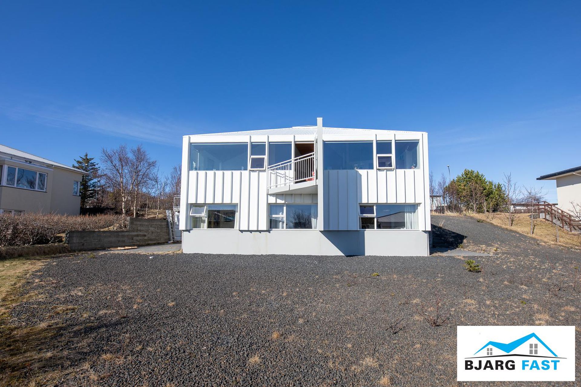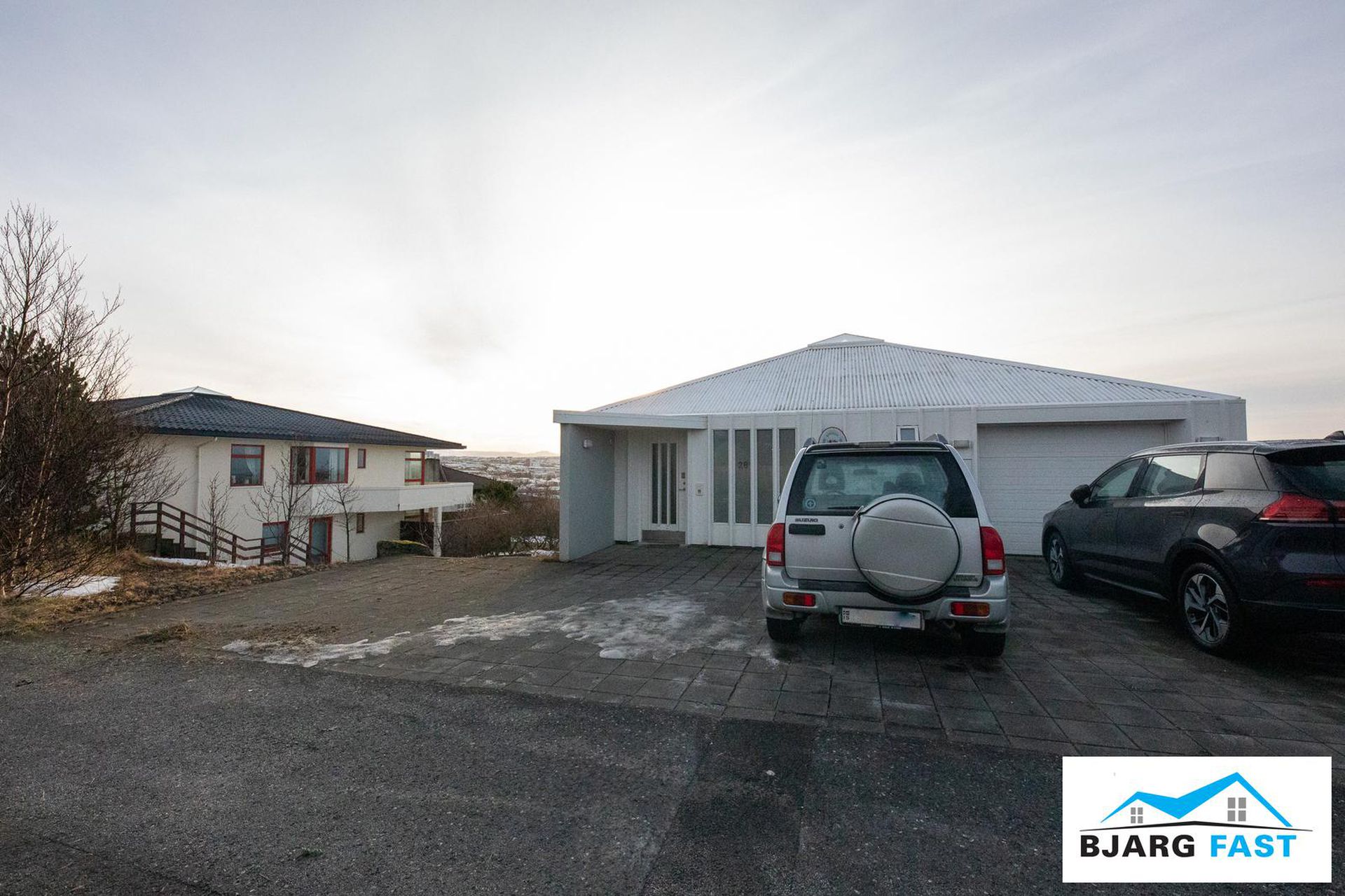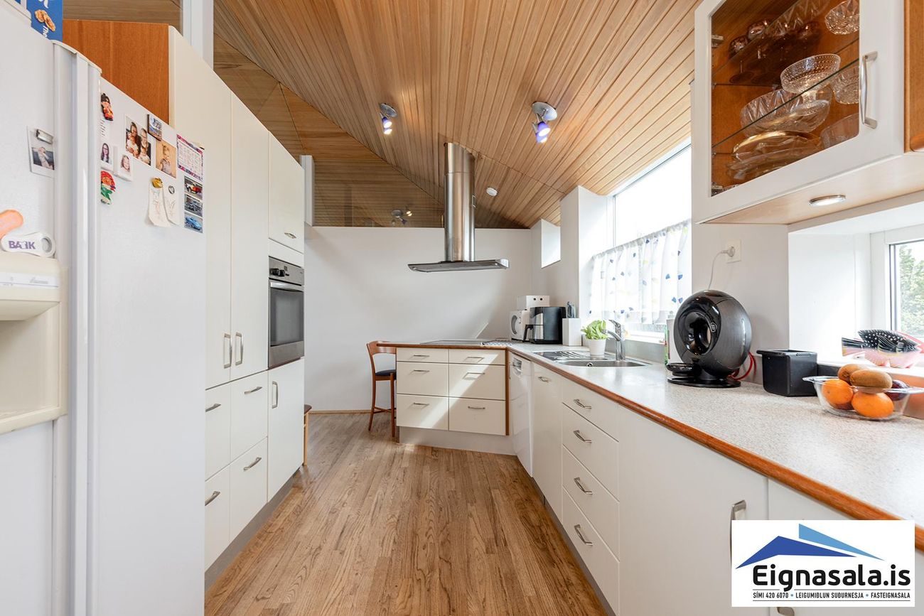 Efri hæð: Flísalögð forstofa, hol, setustofa, borðstofa, rúmgott eldhús, gestasnyrting, sem er flísalögð. Auk þess eru bílskúr og geymsla á efri hæðinni.