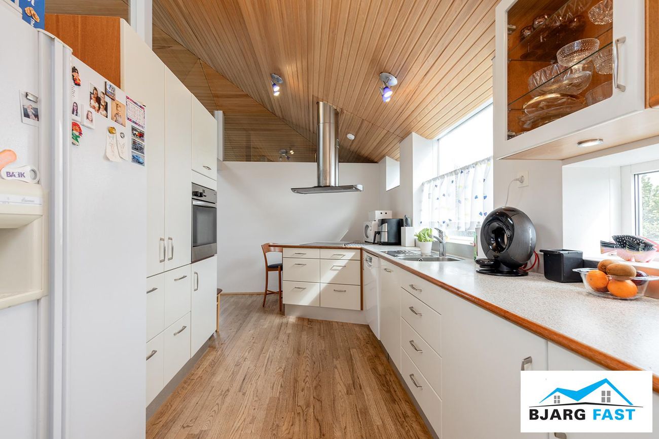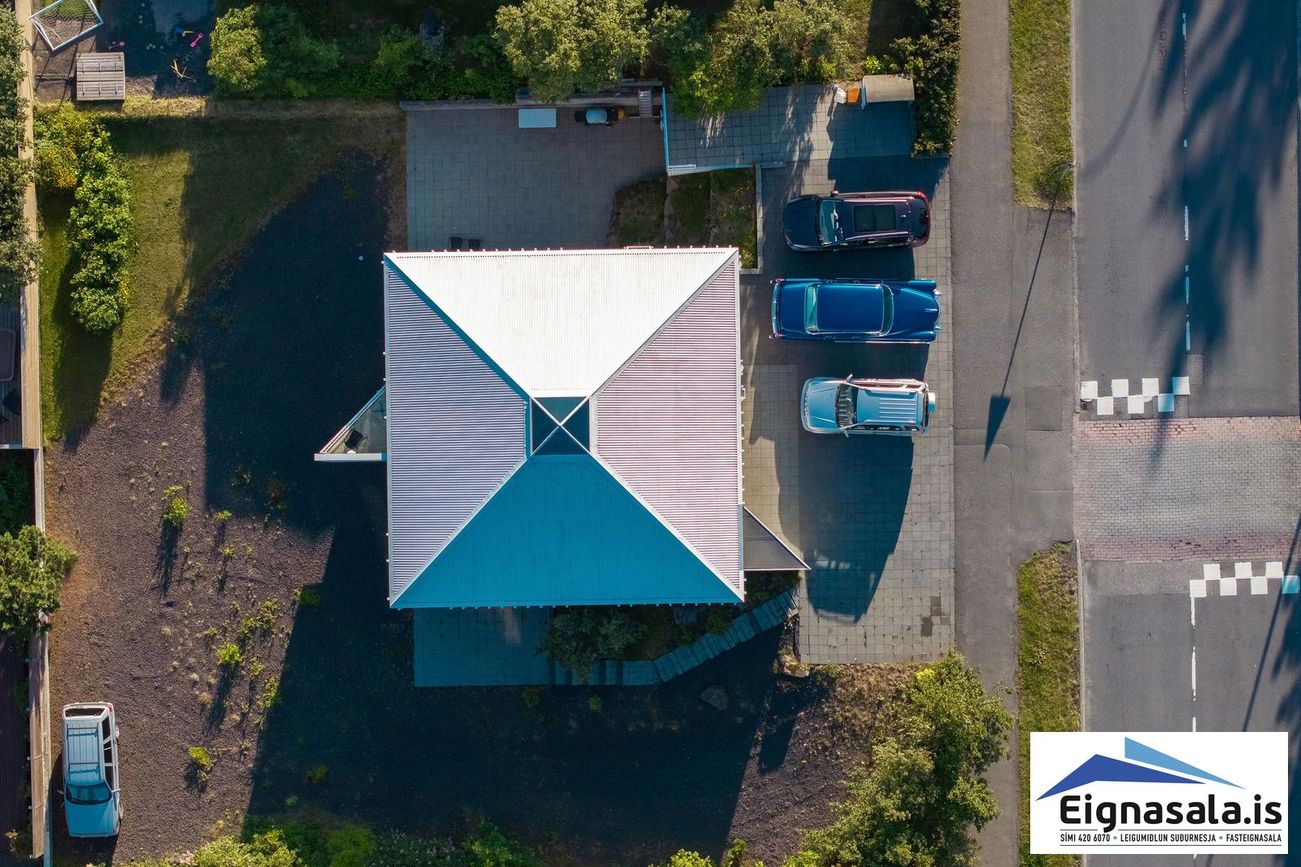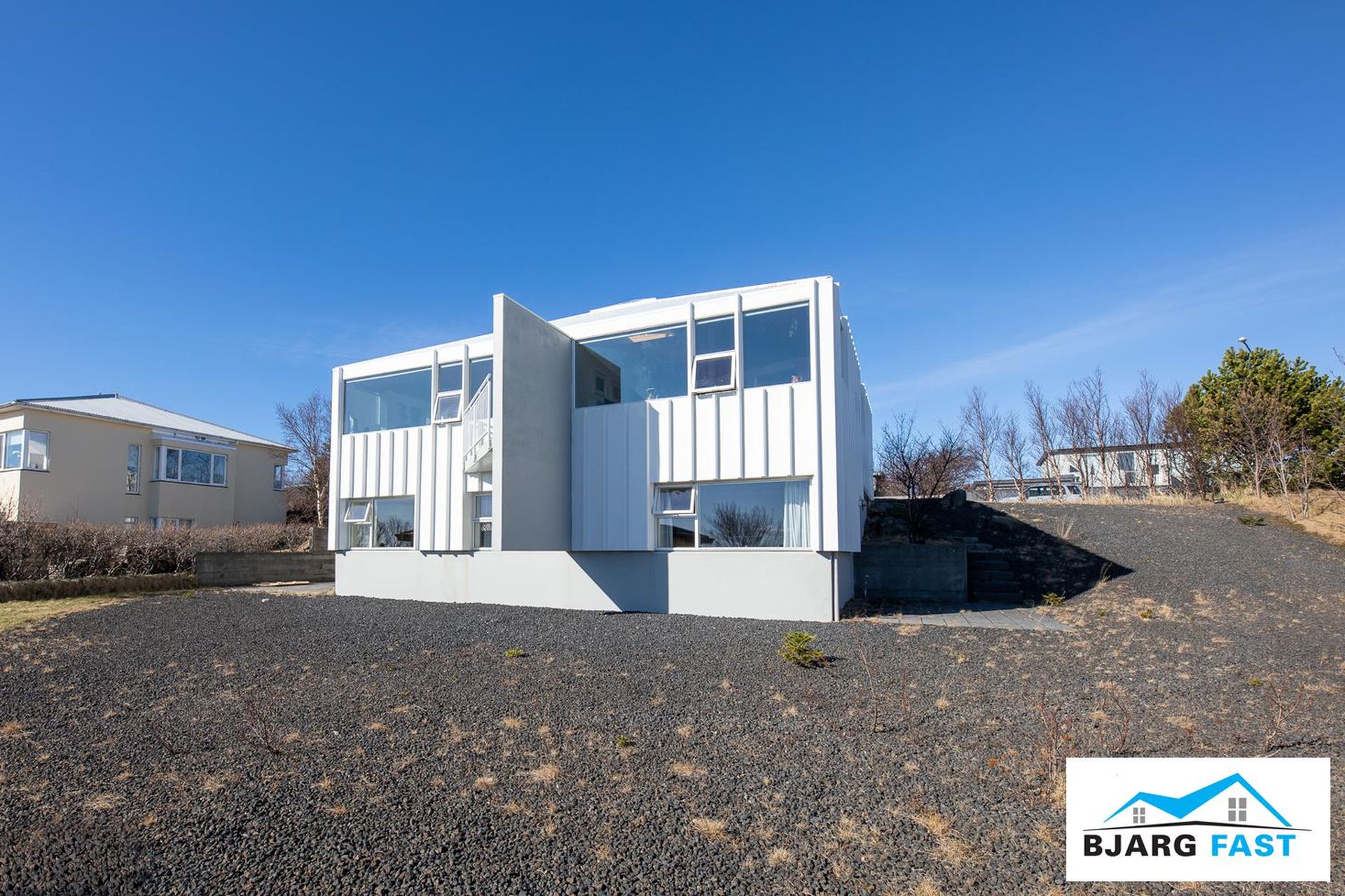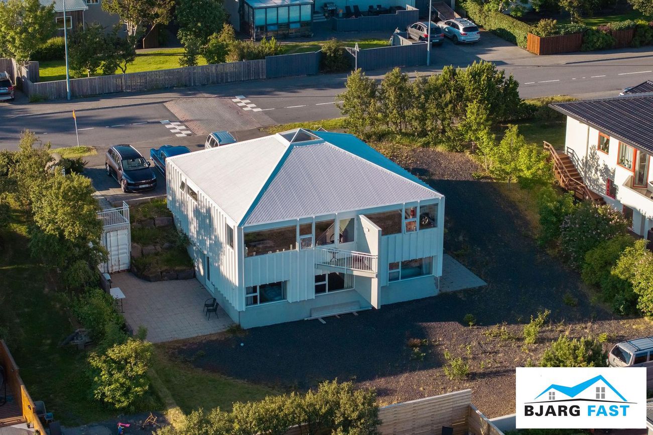 Efri hæð: Flísalögð forstofa, hol, setustofa, borðstofa, rúmgott eldhús, gestasnyrting, sem er flísalögð. Auk þess eru bílskúr og geymsla á efri hæðinni.