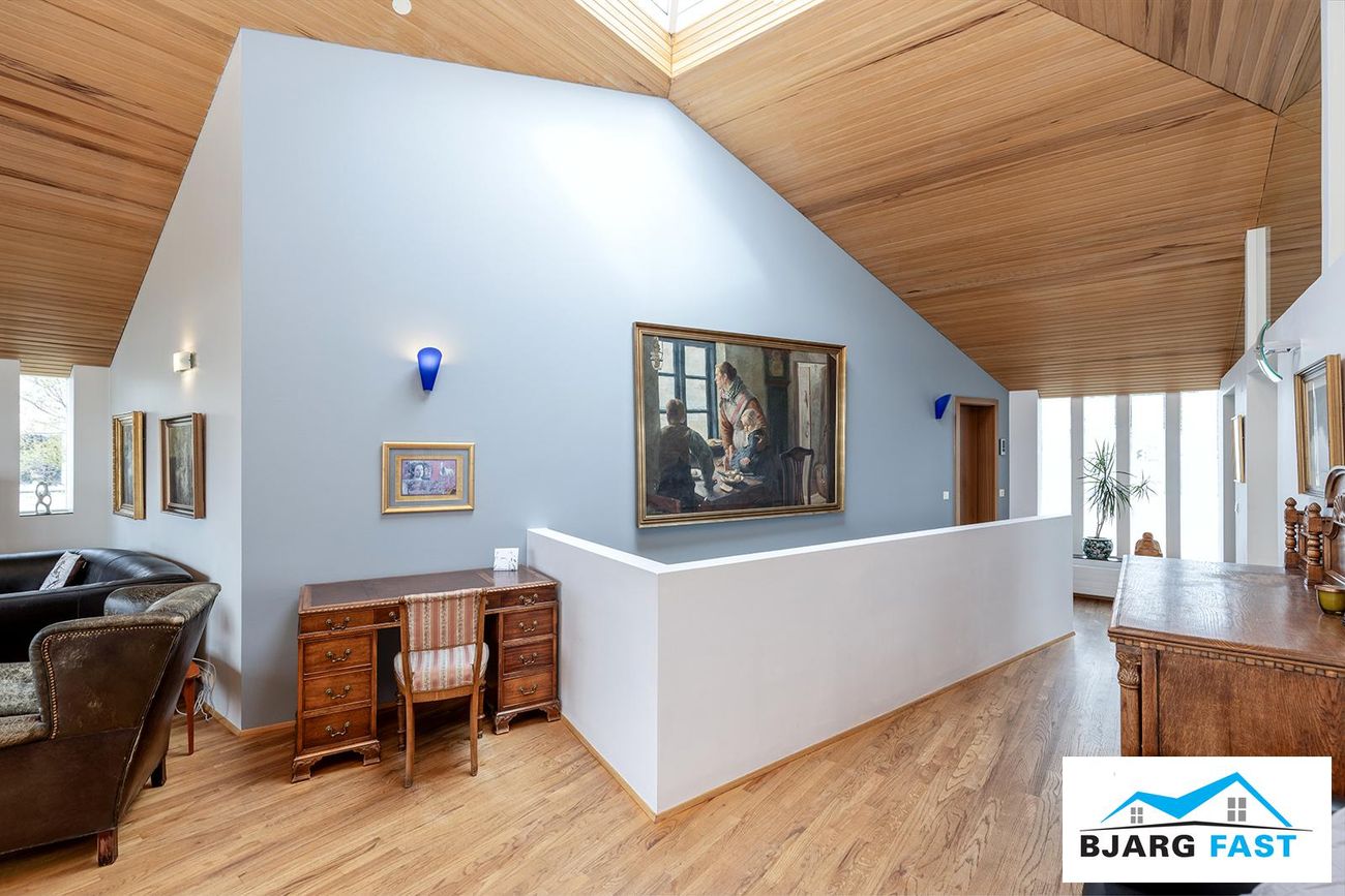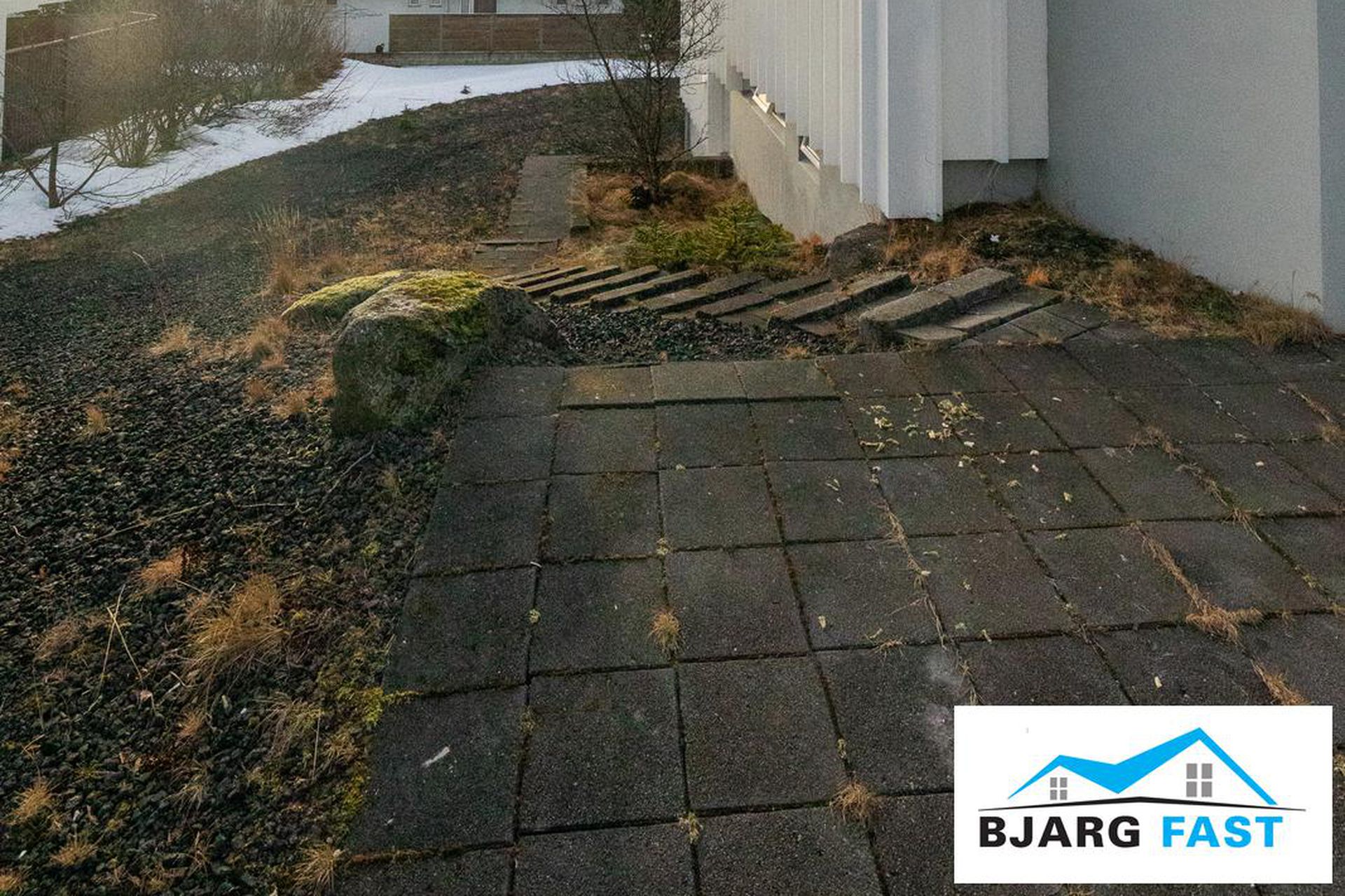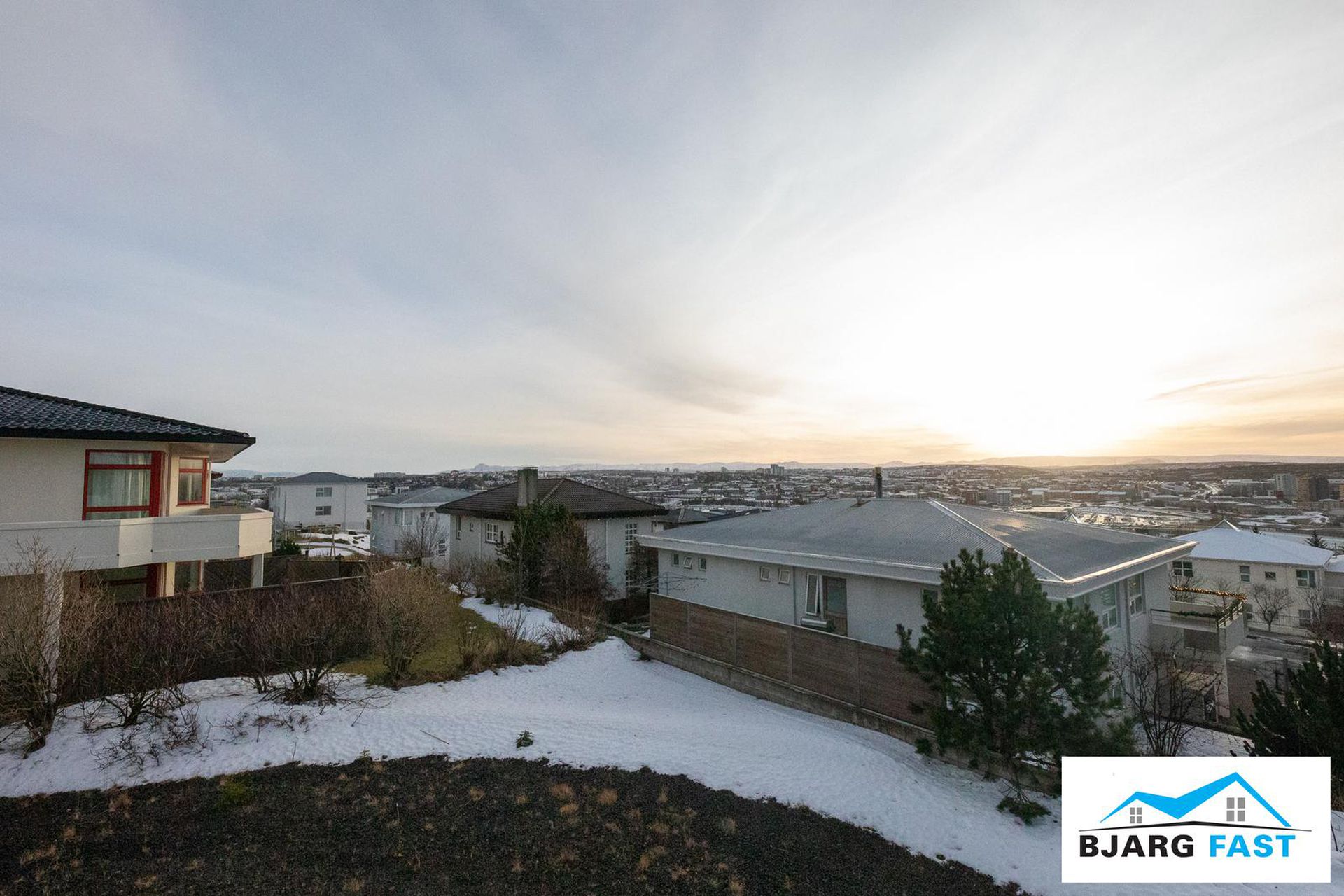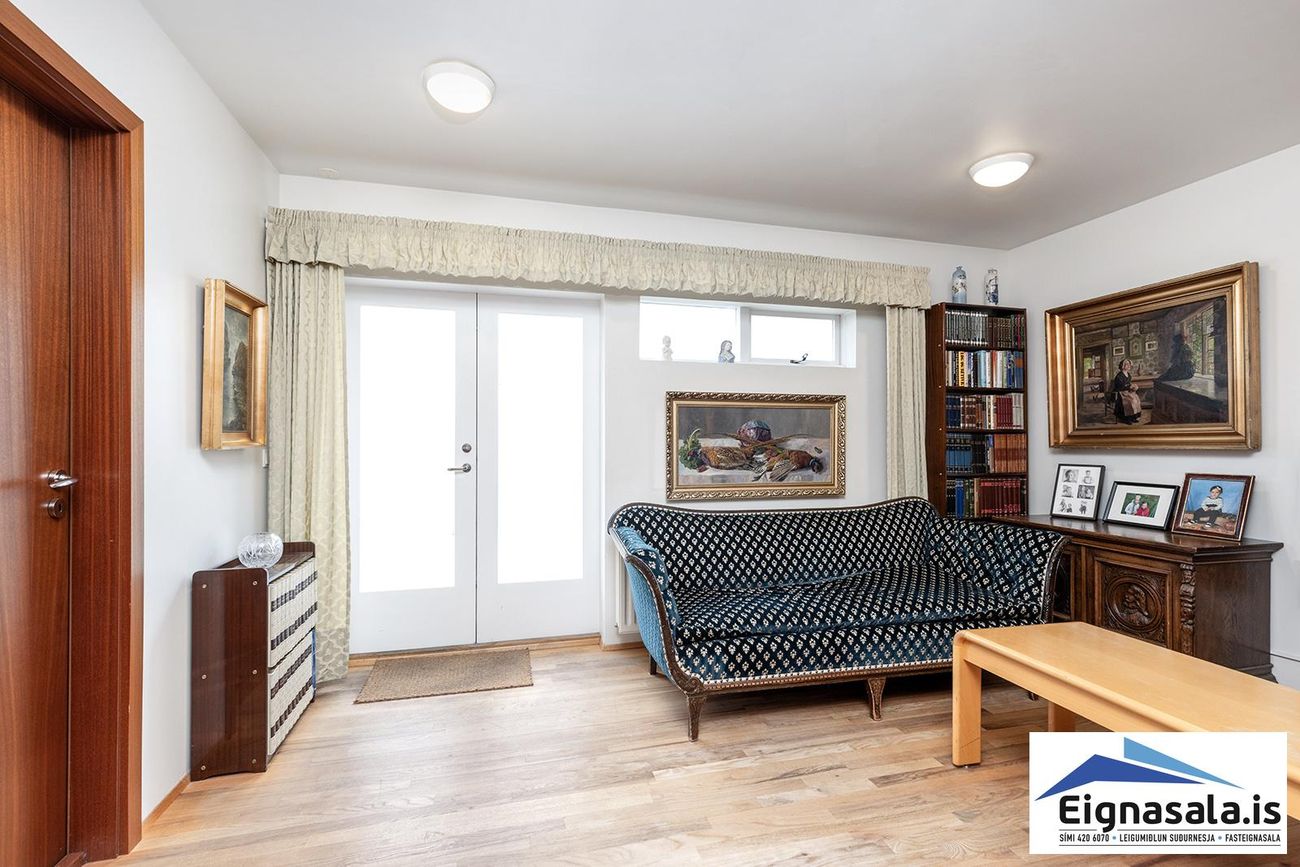 Neðri hæð: Stórt hjónaherbergi, útgengi út í garðinn. Sjónvarpsstofa, útgengi til vesturs út á stóra, hellulagða verönd. Þrjú barna herbergi. baðherbergi sem er flísalagt hólf í golf og þvottahús.