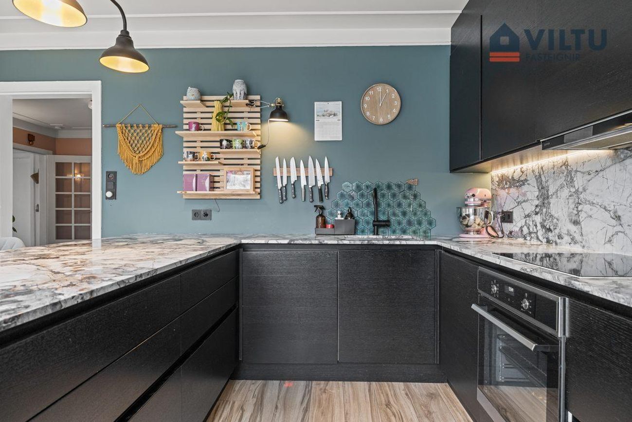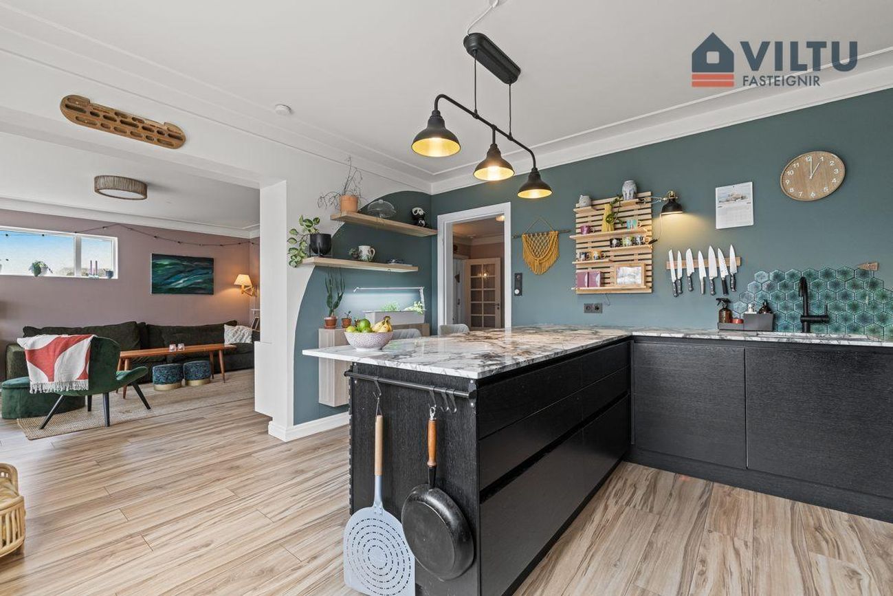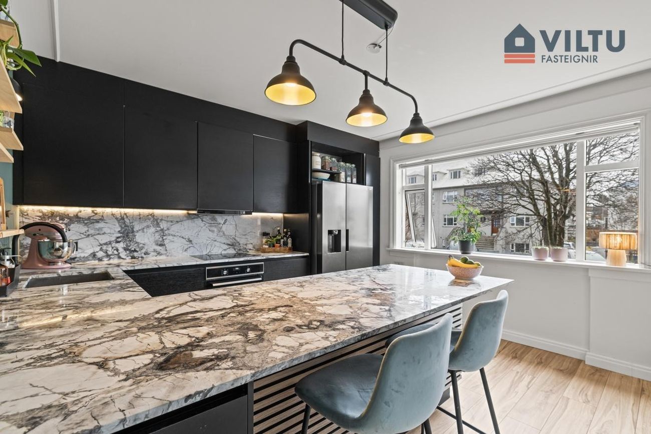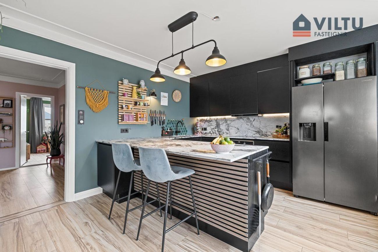 Eldhús: Stílhrein og vönduð innrétting frá HTH með endurnýjuðum heimilistækjum og steini á öllum borðum. Pláss fyrir amerískan ísskáp. Góður skagi sem hægt er að sitja við.