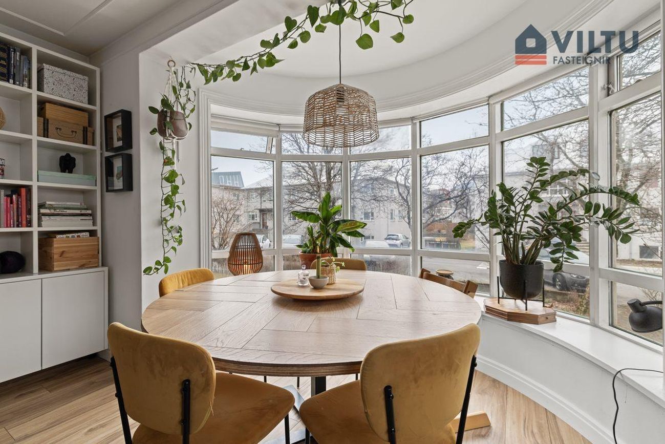 Stofa/borðstofa: Bjart og rúmgott rými með bogadregnum útskotsglugga til suðurs sem setur fallegan svip á rýmið.