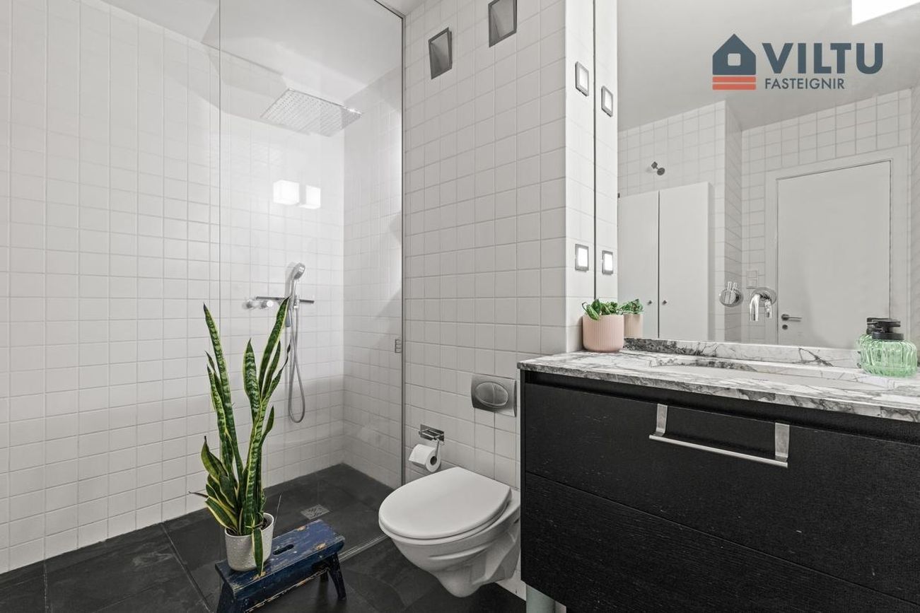 Baðherbergi: Flísalagt í hólf og gólf. Walk inn sturta og innbyggt upphengt salerni. Stór handklæðaofna og HTH vaskaskápur með steini á borði. Vönduð blöndunartæki í sturtu og við vask.