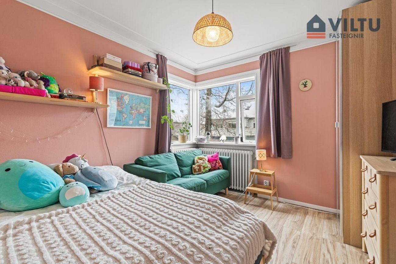 Svefnherbergi II: Rúmgott herbergi með fallegum hornglugga. Gengið er í þetta herbergi frá forstofu.
