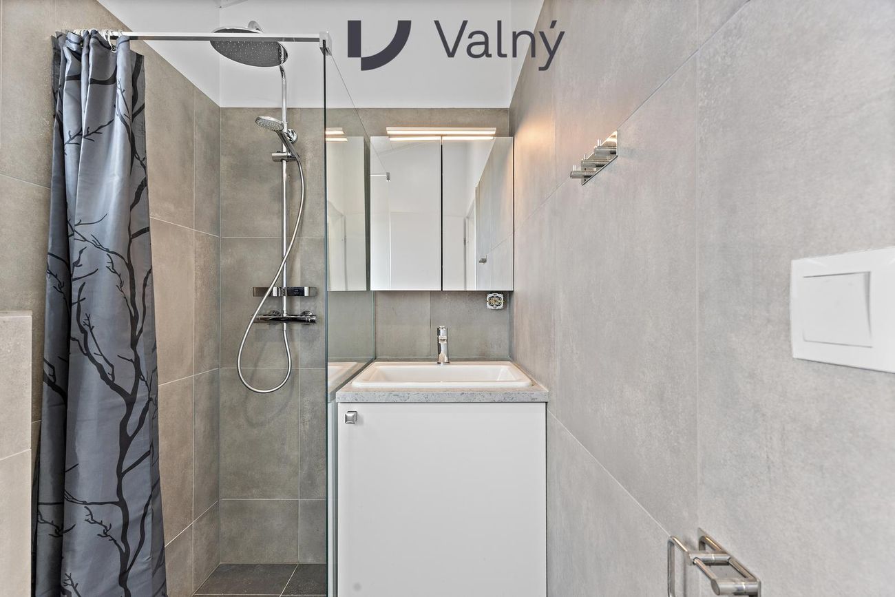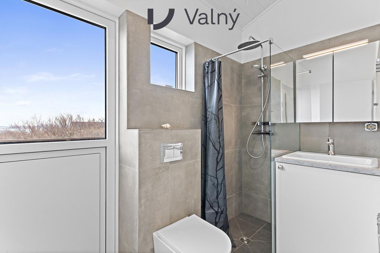 Baðherbergi er flísalagt í hólf og gólf með hvítri innréttingu og útgengi út á verönd.