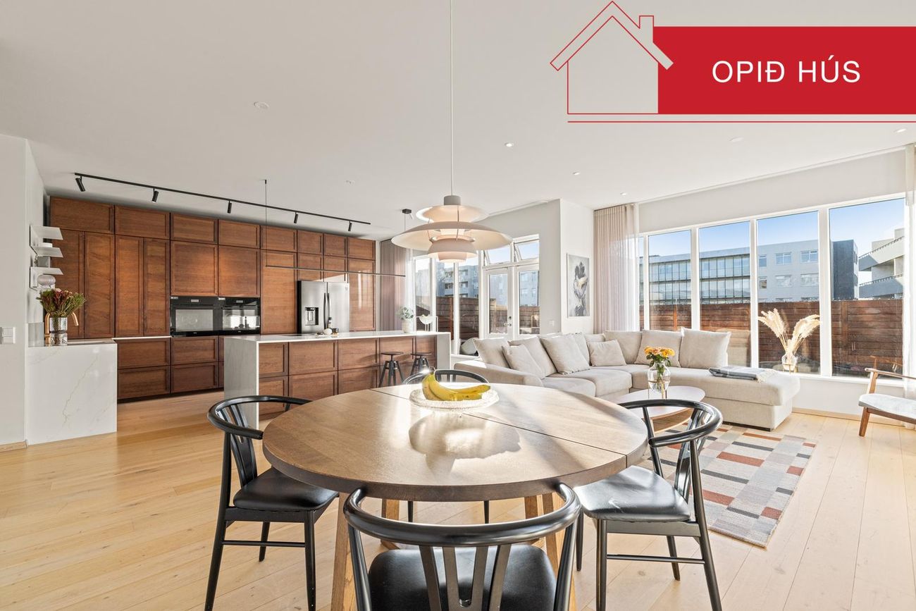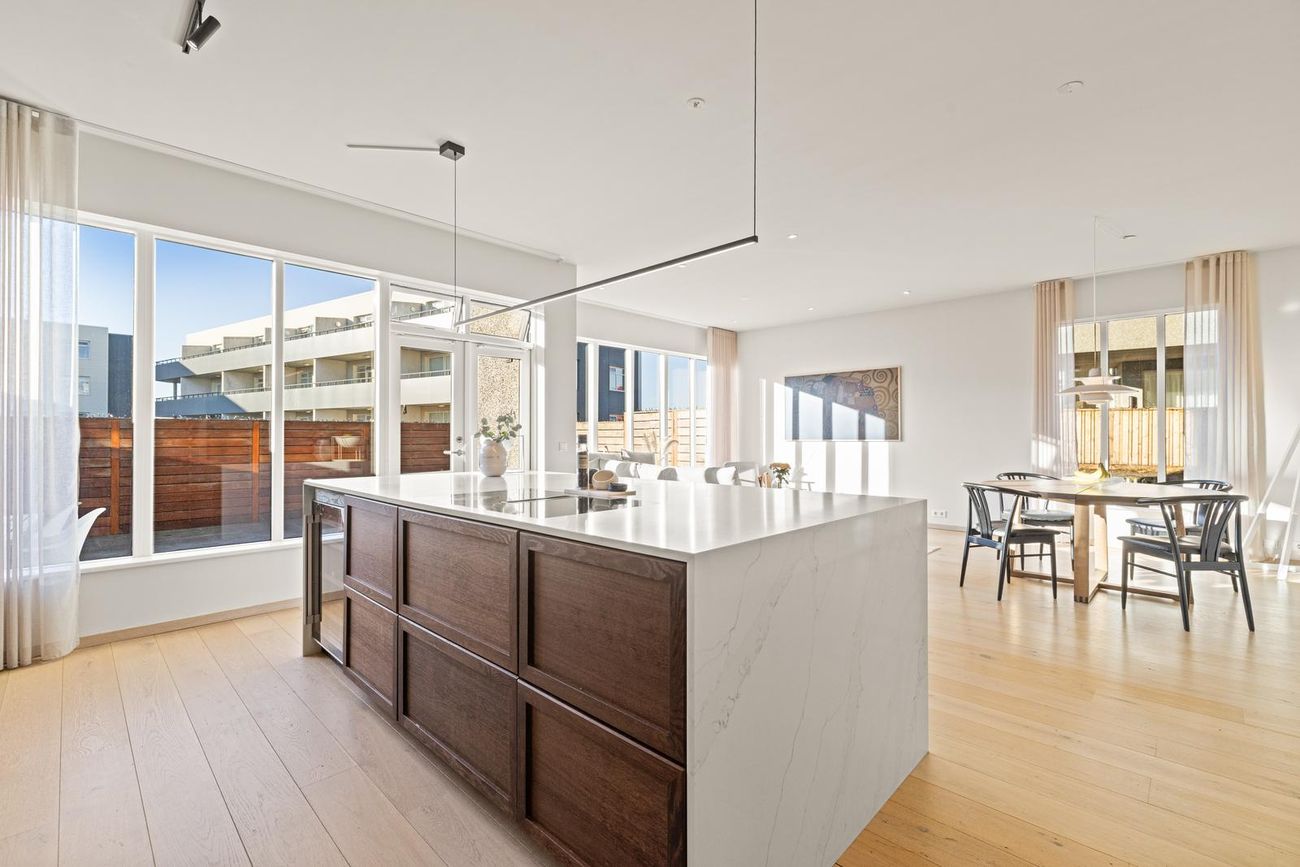 Eldhús: Opið rými við stofu/borðstofu. Endurnýjað á vandaðan hátt af núverandi eigendum. Falleg viðarinnrétting með mjög stórri eldhússeyju og góðu skápaplássi. Steinborðplötur. Tveir ofnar í fullri stærð í vinnuhæð, innbyggð uppþvottavél og stæði fyrir amerískan ísskáp. Helluborð með innbyggðu niðursogi er í eyjunni og jafnframt vínkælir sem fylgir með.