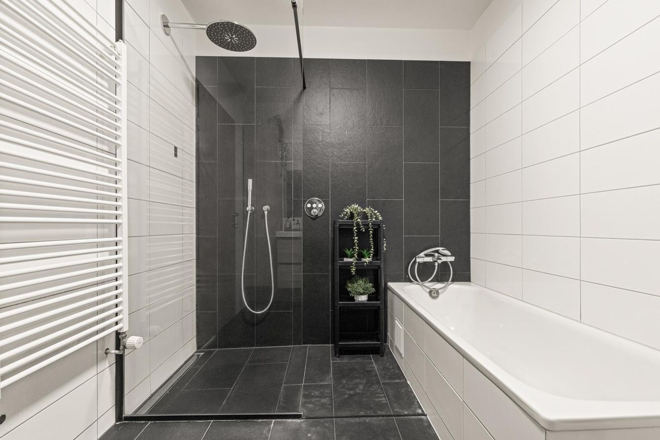 Baðherbergi: Flísalagt í hólf og gólf. Baðkar og rúmgóð "walk in" sturta. Góð innrétting með ofanáliggjandi vaski. Upphengt salerni og handklæðaofn. Flísar á veggum og gólfi.