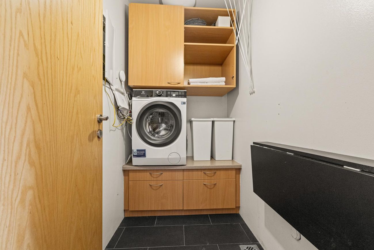 Þvottahús: Innrétting með stæði fyrir þvottavél og þurrkara. Þvottasnúrur og frálagsborð