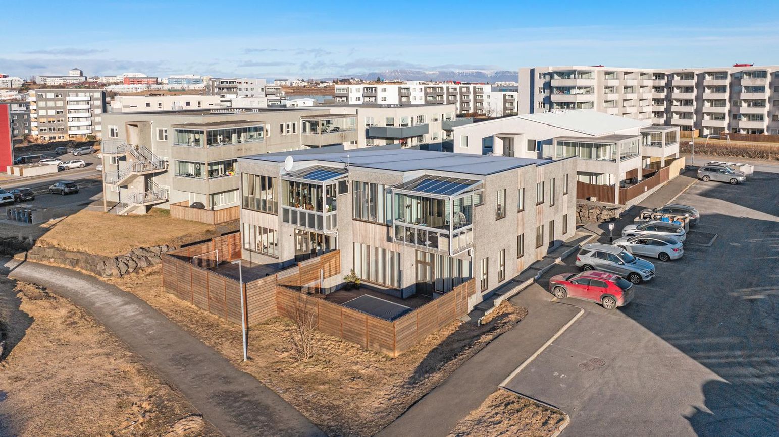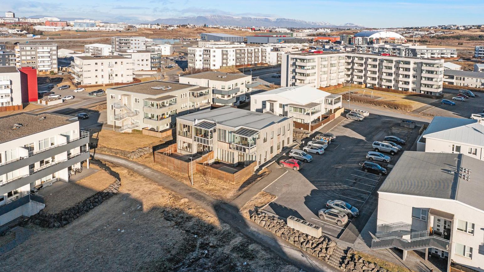 Hluti bílastæða er með hleðslustöð fyrir rafmagnsbíla.Snjóbræðsla í stétt og tröppum.