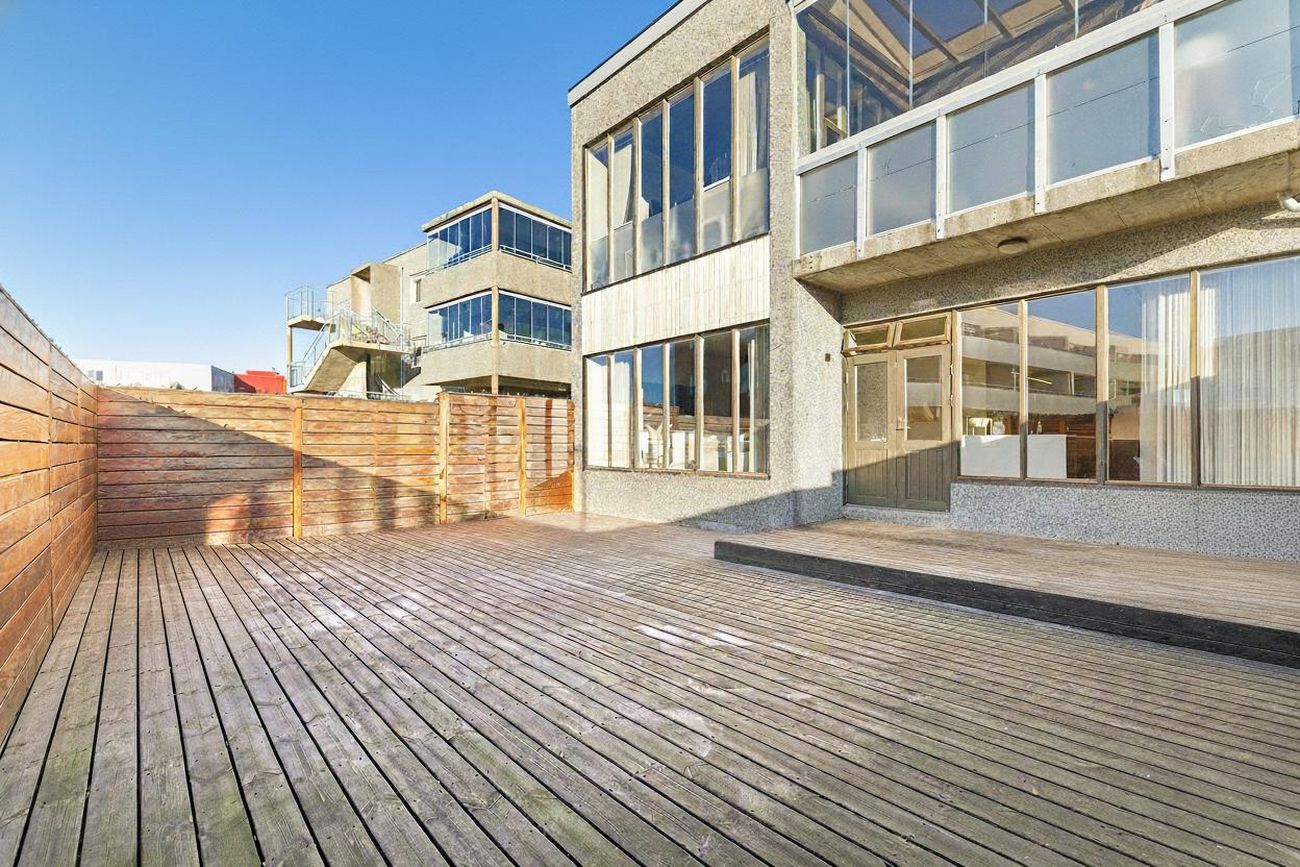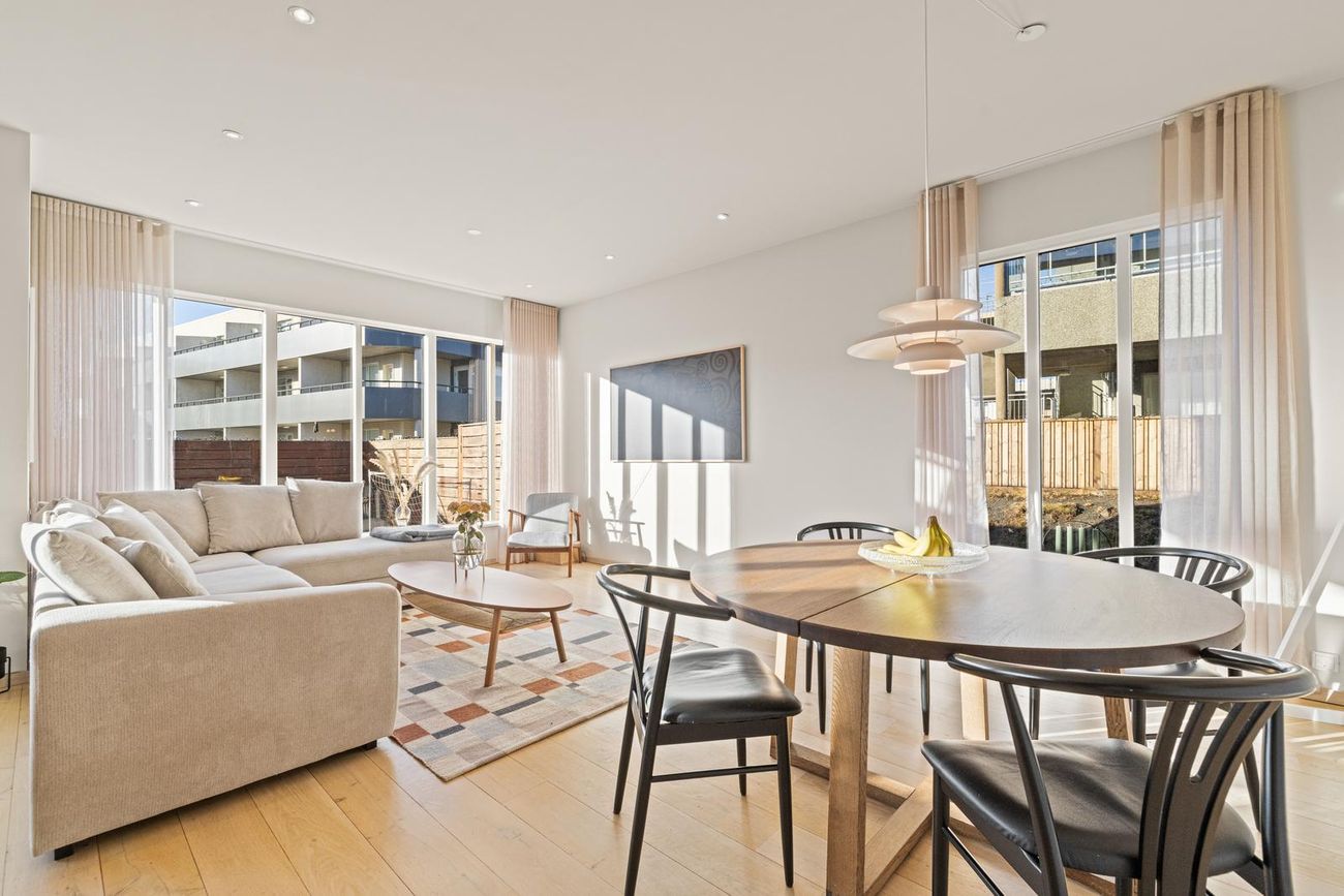 Stofa/borðstofa: Afar rúmgóð og björt. Útgengi út stóra viðarverönd með góðri hárri skjólgirðingu, til suðvesturs.Opnanlegt hlið er inn á viðarveröndina.