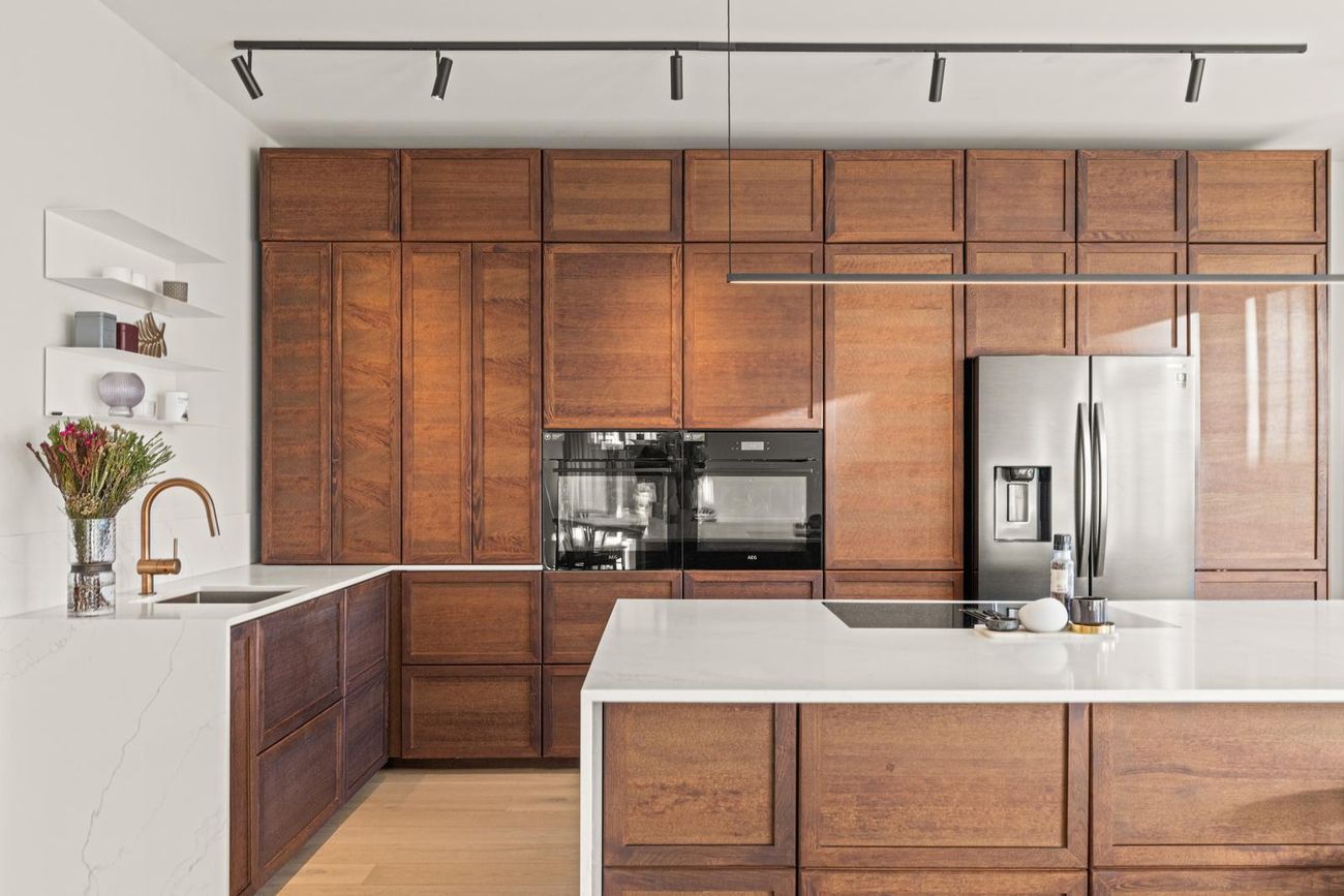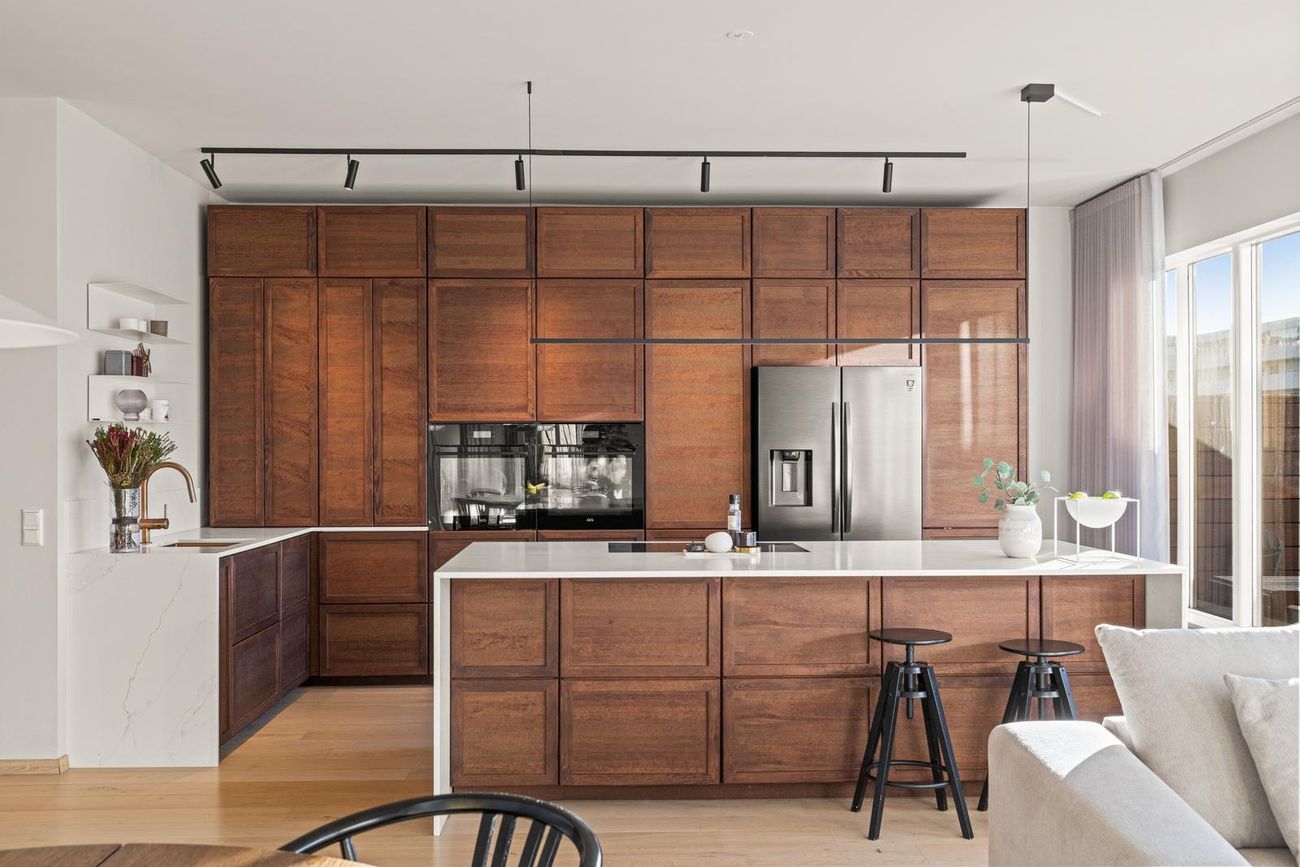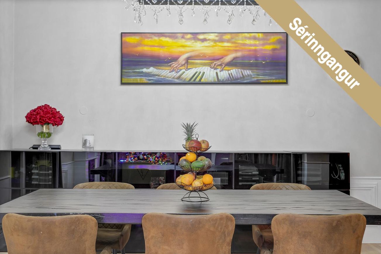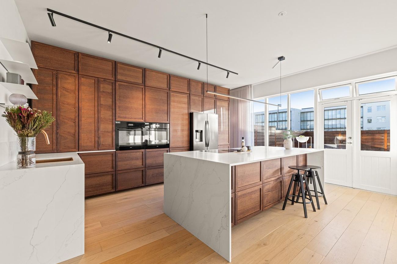 Eldhús: Opið rými við stofu/borðstofu. Endurnýjað á vandaðan hátt af núverandi eigendum. Falleg viðarinnrétting með mjög stórri eldhússeyju og góðu skápaplássi. Steinborðplötur. Tveir ofnar í fullri stærð í vinnuhæð, innbyggð uppþvottavél og stæði fyrir amerískan ísskáp. Helluborð með innbyggðu niðursogi er í eyjunni og jafnframt vínkælir sem fylgir með.