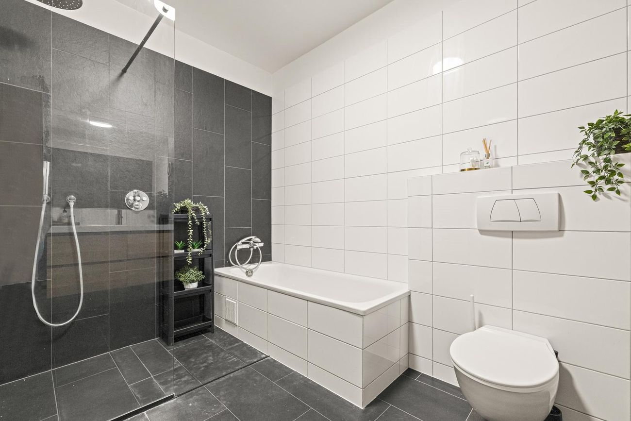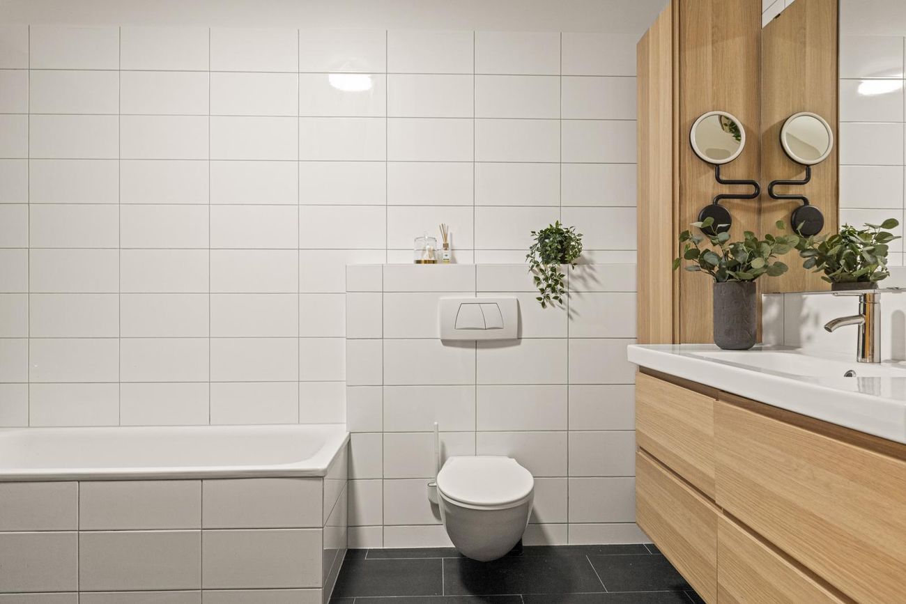 Baðherbergi: Flísalagt í hólf og gólf. Baðkar og rúmgóð "walk in" sturta. Góð innrétting með ofanáliggjandi vaski. Upphengt salerni og handklæðaofn. Flísar á veggum og gólfi.