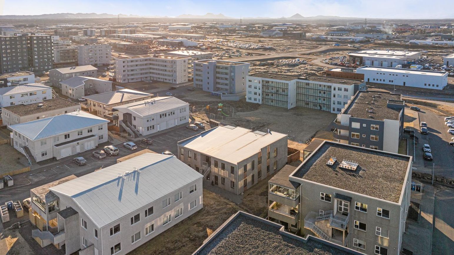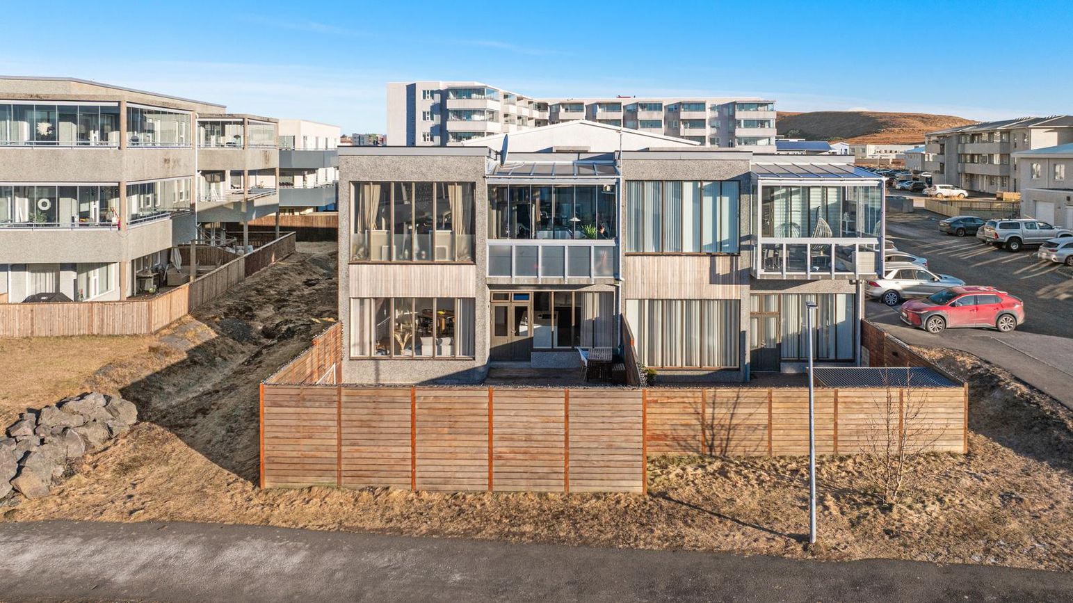 Hluti bílastæða er með hleðslustöð fyrir rafmagnsbíla.Snjóbræðsla í stétt og tröppum.