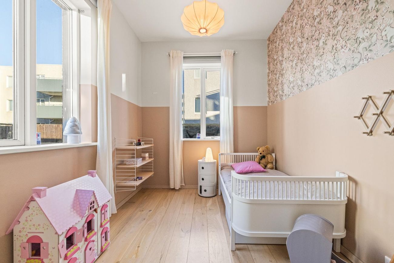 .Möguleiki að breyta þvottahúsi í gestasnyrtingu og færa þvottahús í geymslu.Geymsla: Með upphengdum hillum.