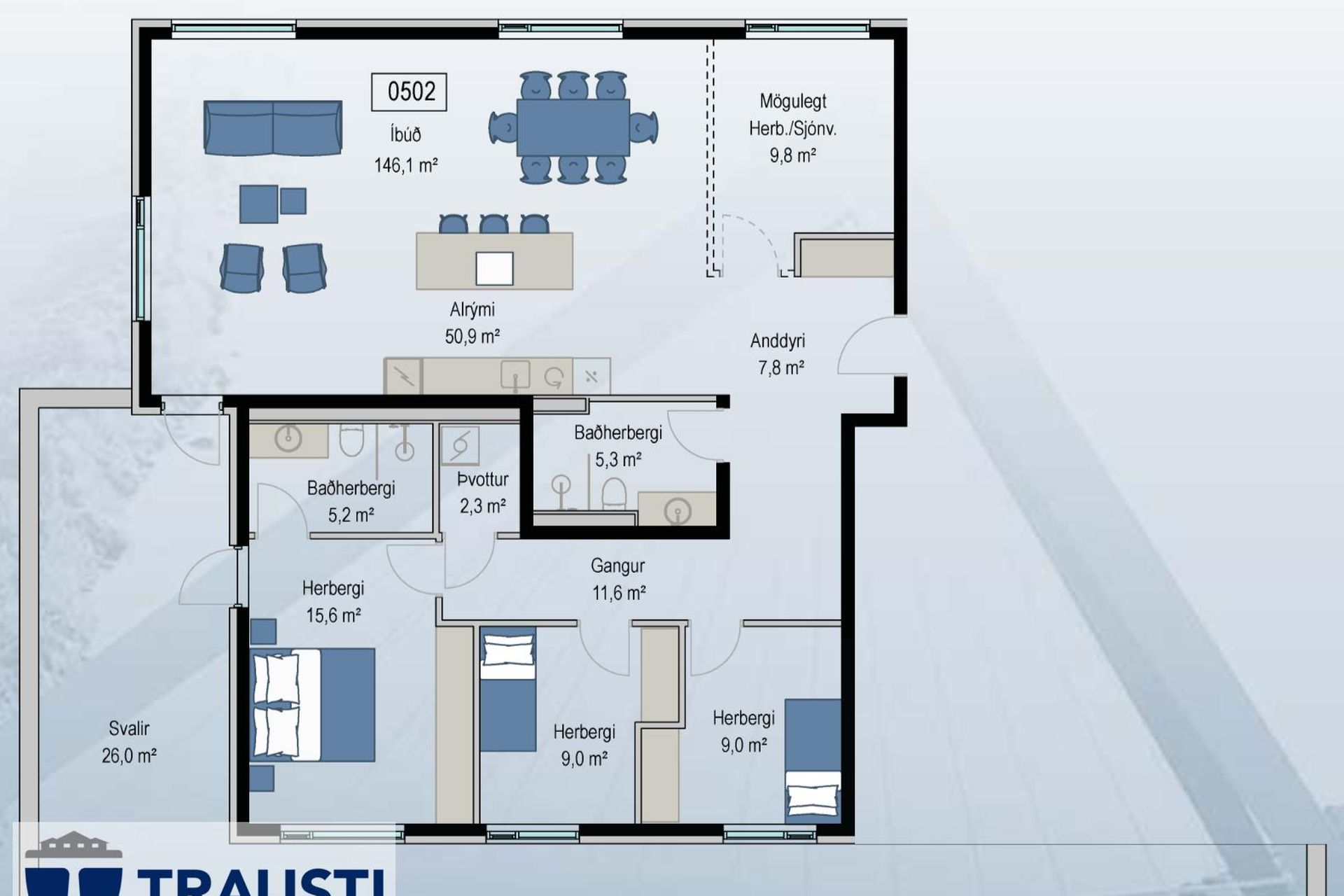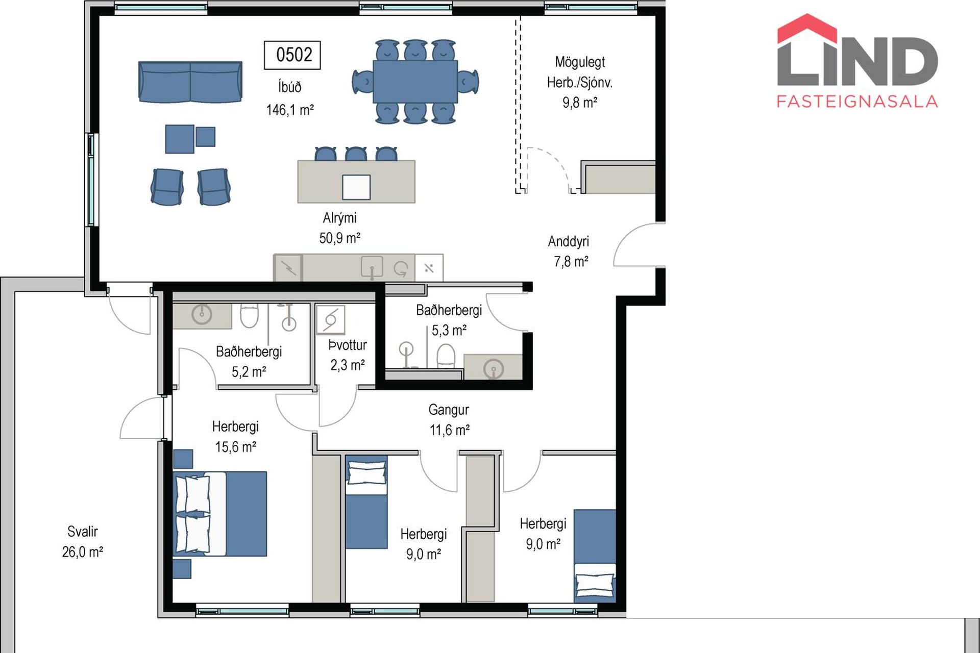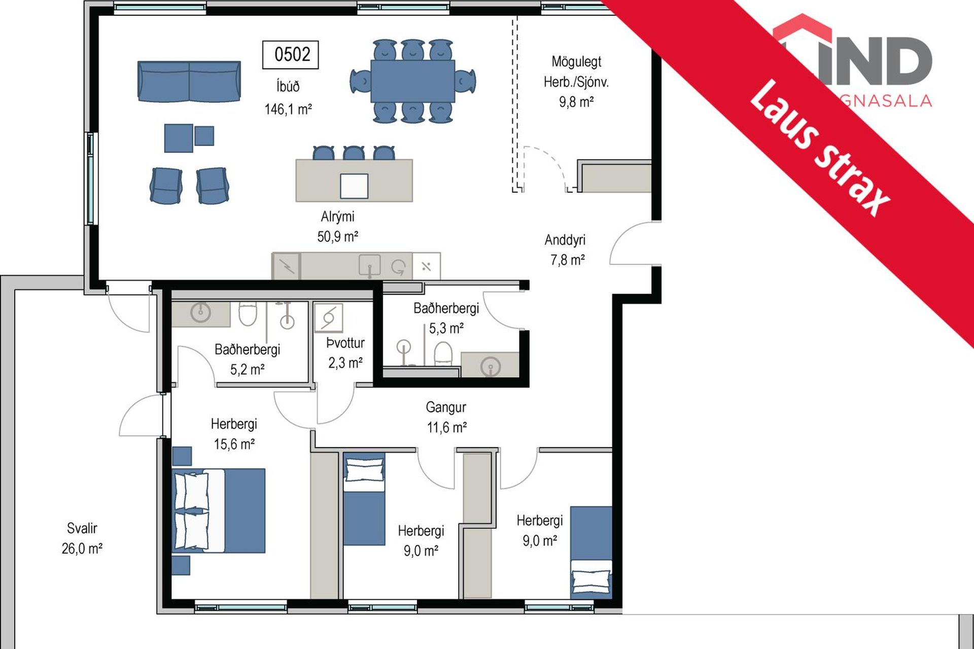 0502 ![]() | 4 | 170,70 m² | 144.900.000 kr. 13. janúar 2026 | 142.000.000 kr. 16. mars 2026 |