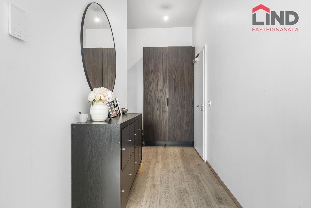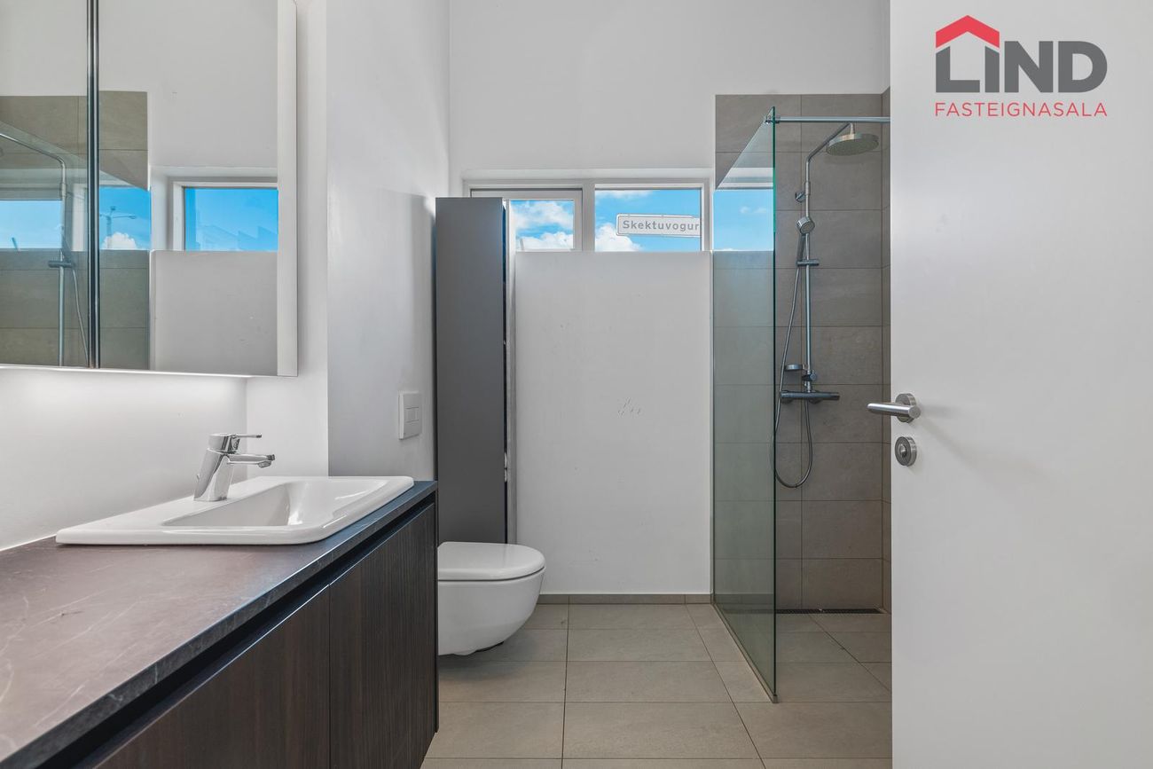 Baðherbergi: Með flísum á gólfi og hluta veggja. Flísalögð sturta með glerþili og falleg innrétting við vask með speglaskáp fyrir ofan. Handklæðaofn, upphengt salerni og opnanlegur gluggi. Tengi fyrir þvottavél og þurrkara inn af baðherbergi