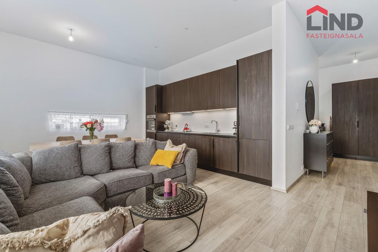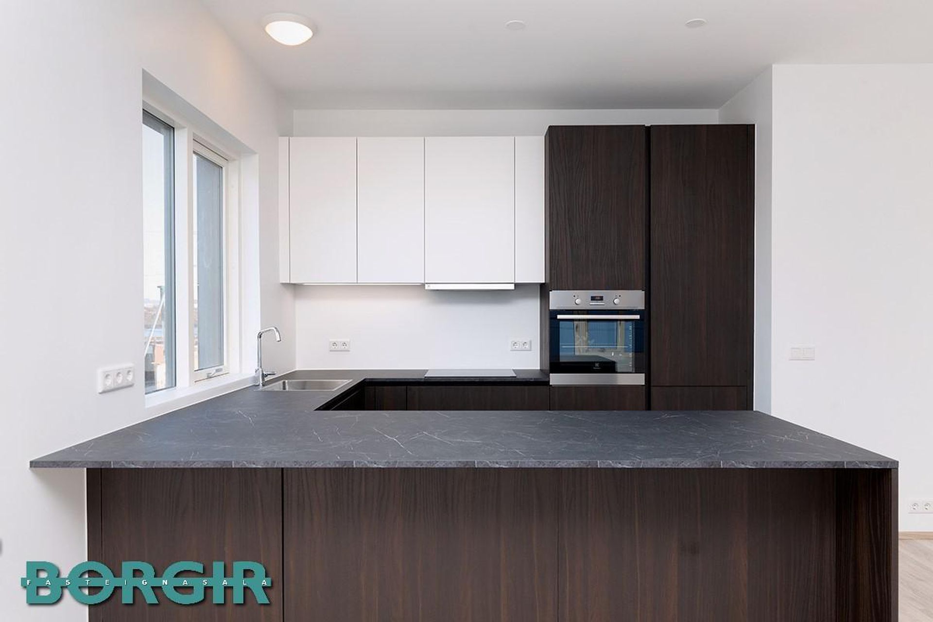 Eldhús: Með harðparketi á gólfi og fallegri eldhúsinnréttingu frá Nobila (GKS) með góðu skápaplássi. Innbyggður kæliskápur með frysti, innbyggð uppþvottavél, spansuðuhelluborð, bakaraofn og vifta. Stýranleg lýsing undir skápum og gluggi til suðurs.