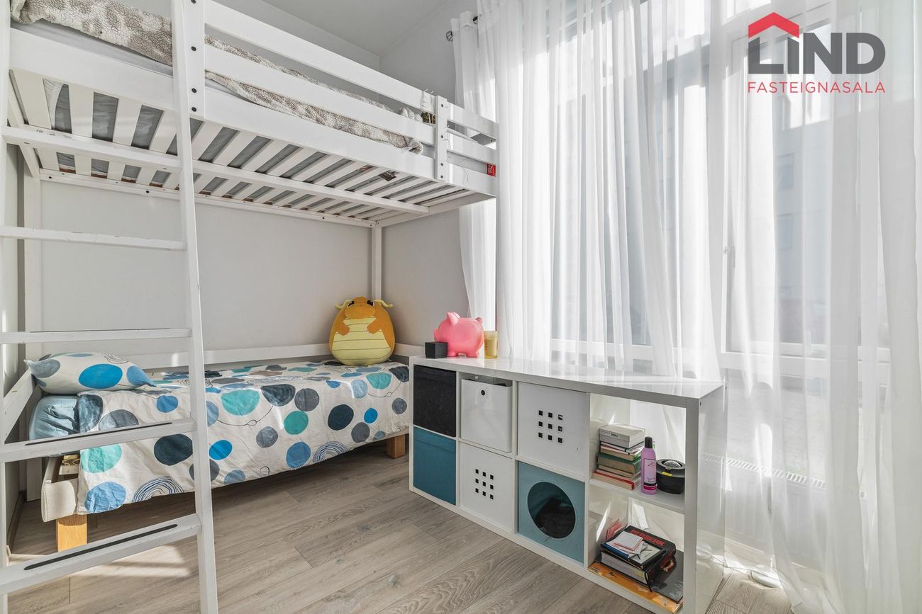 Svefnherbergi I: Með harðparketi á gólfi, skápum á heilan vegg og glugga til norðurs.