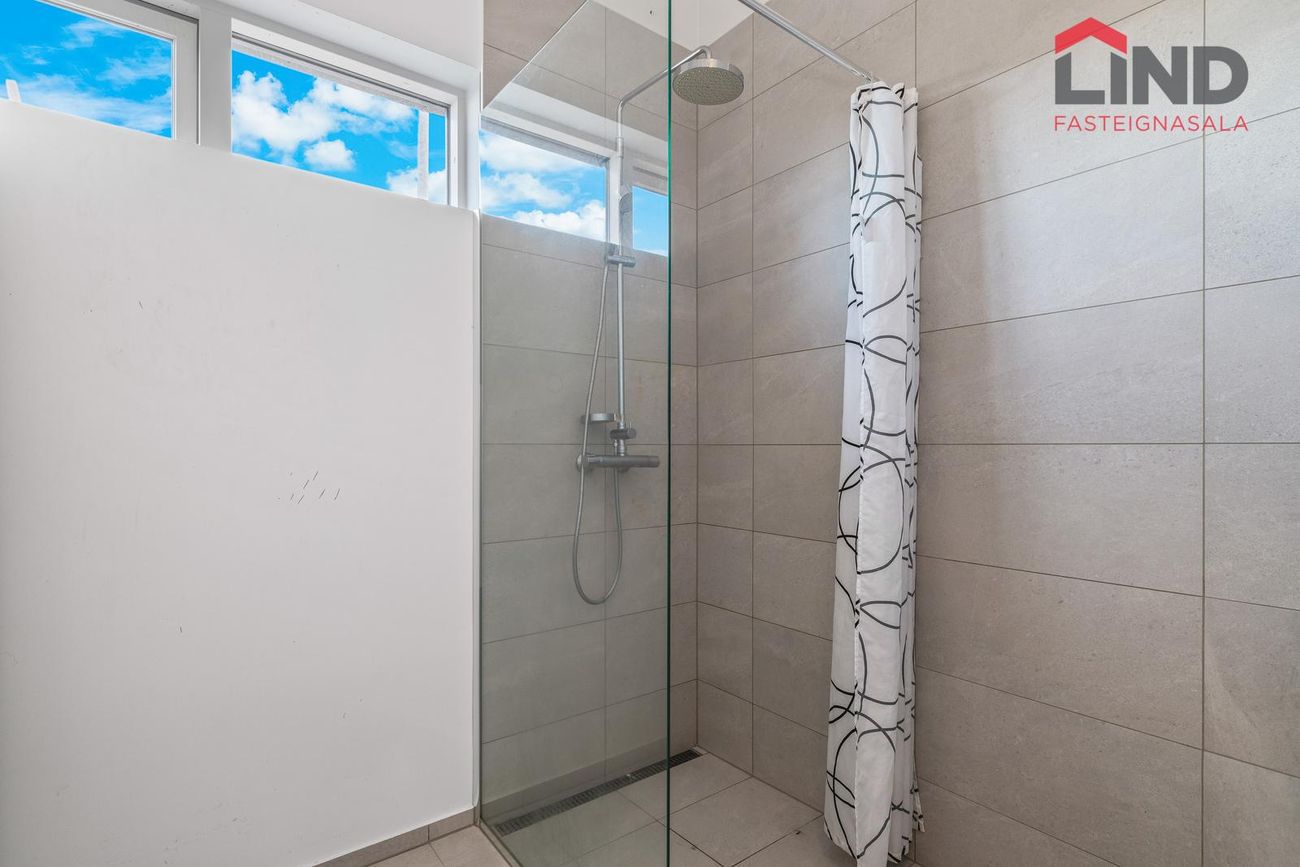 Baðherbergi: Með flísum á gólfi og hluta veggja. Flísalögð sturta með glerþili og falleg innrétting við vask með speglaskáp fyrir ofan. Handklæðaofn, upphengt salerni og opnanlegur gluggi. Tengi fyrir þvottavél og þurrkara inn af baðherbergi