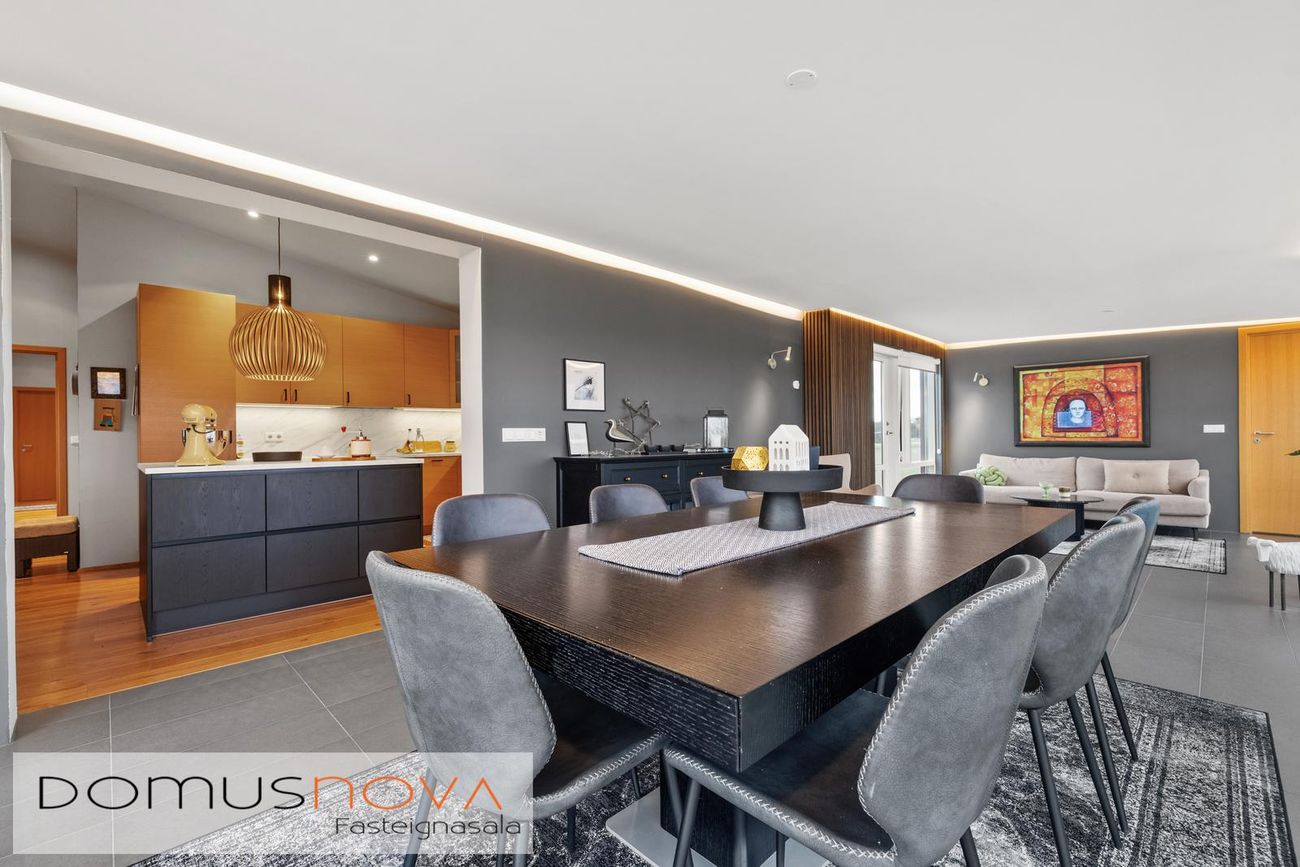 Borðstofa er vel rúmgóð með dökkum flísum á gólfum, innfelldri óbeinni ledlýsingu í loftum og útgengt úr borðstofu á tveimur stöðum, m.a. út á stóran pall sem snýr til suðurs.