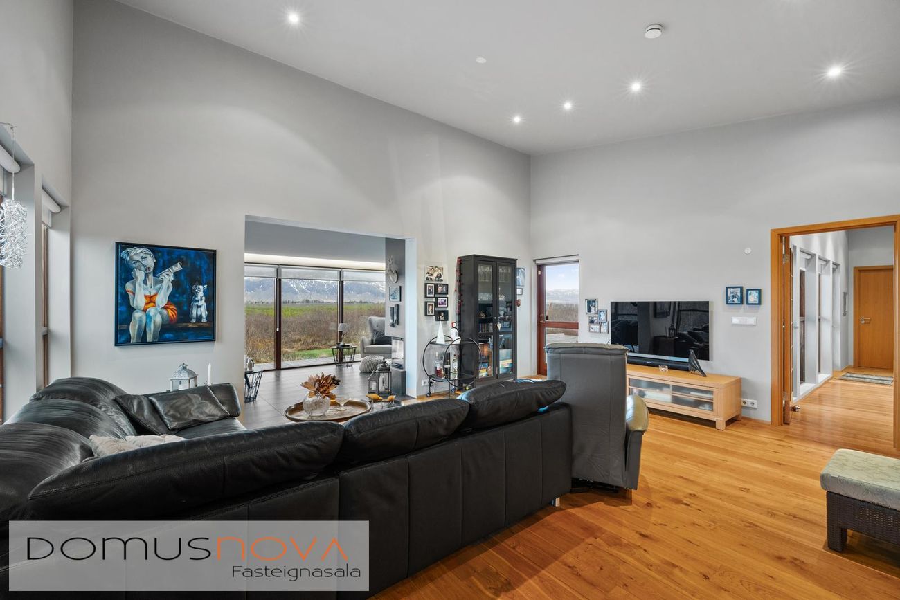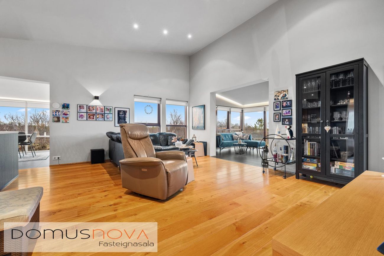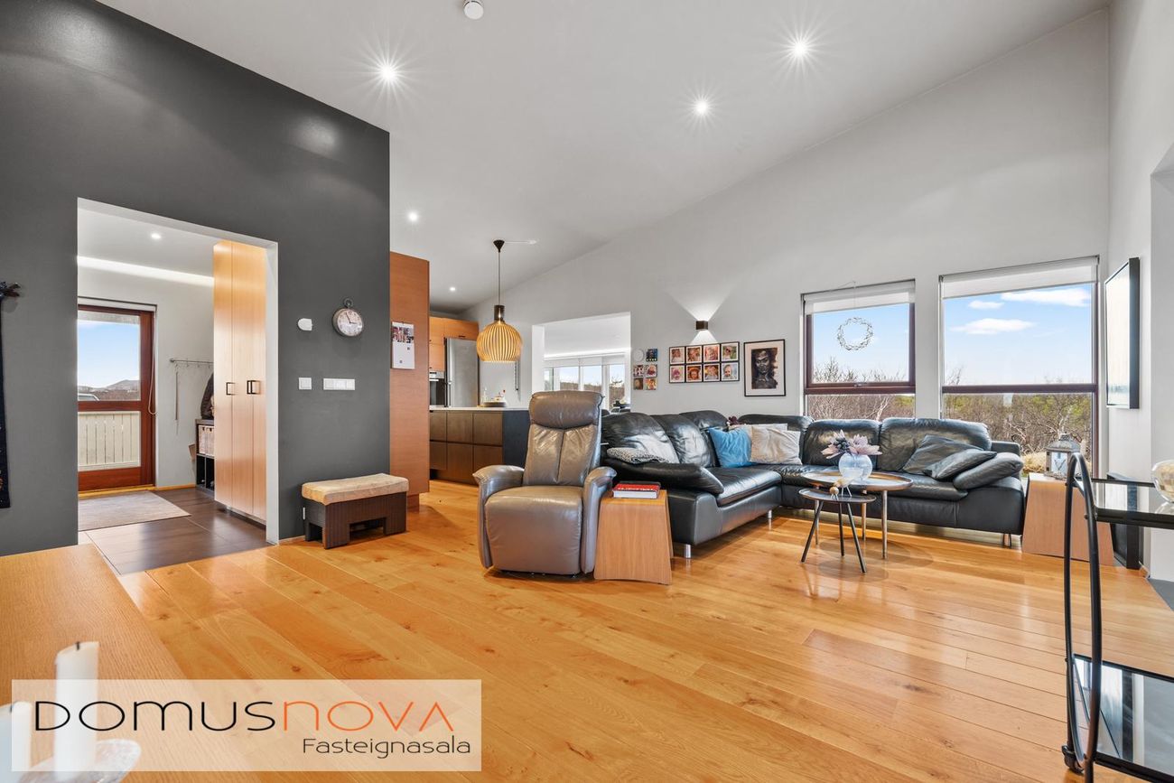 Birt stærð eignar er 221fm, þar af 39,9fm tvöfaldur bílskúr með mikilli lofthæð og tveimur stórum innkeyrsluhurðum.
