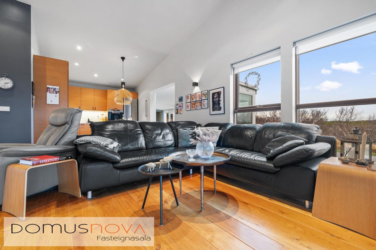 vandað harðviðarparket er á gólfum og tengir stofan saman eldhús, borðstofu og sólstofu.