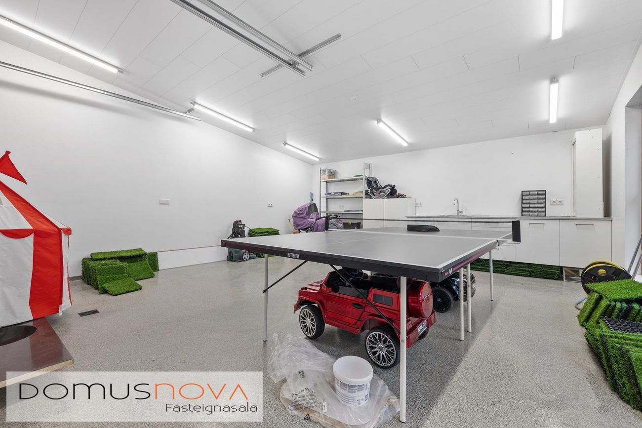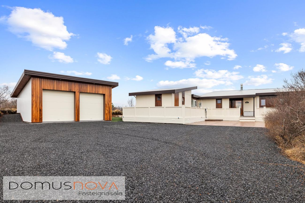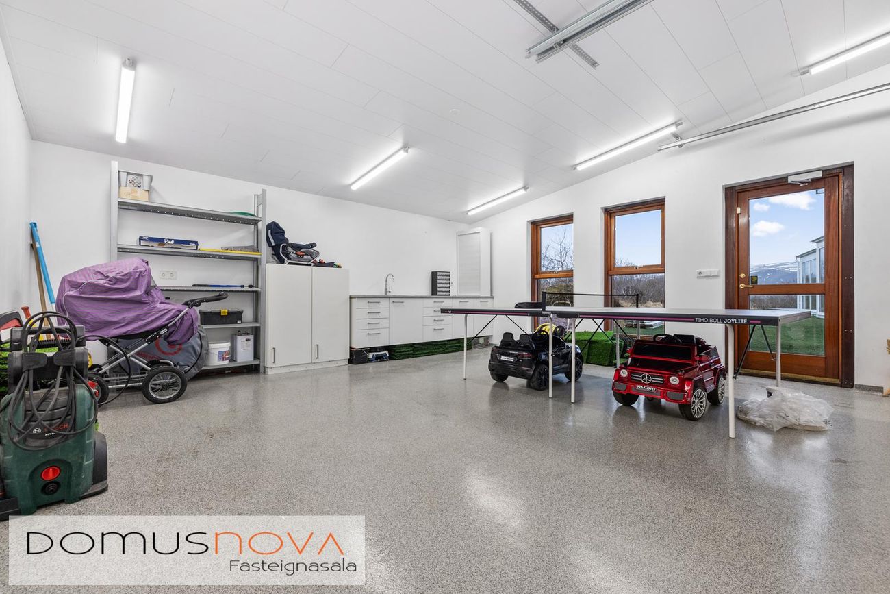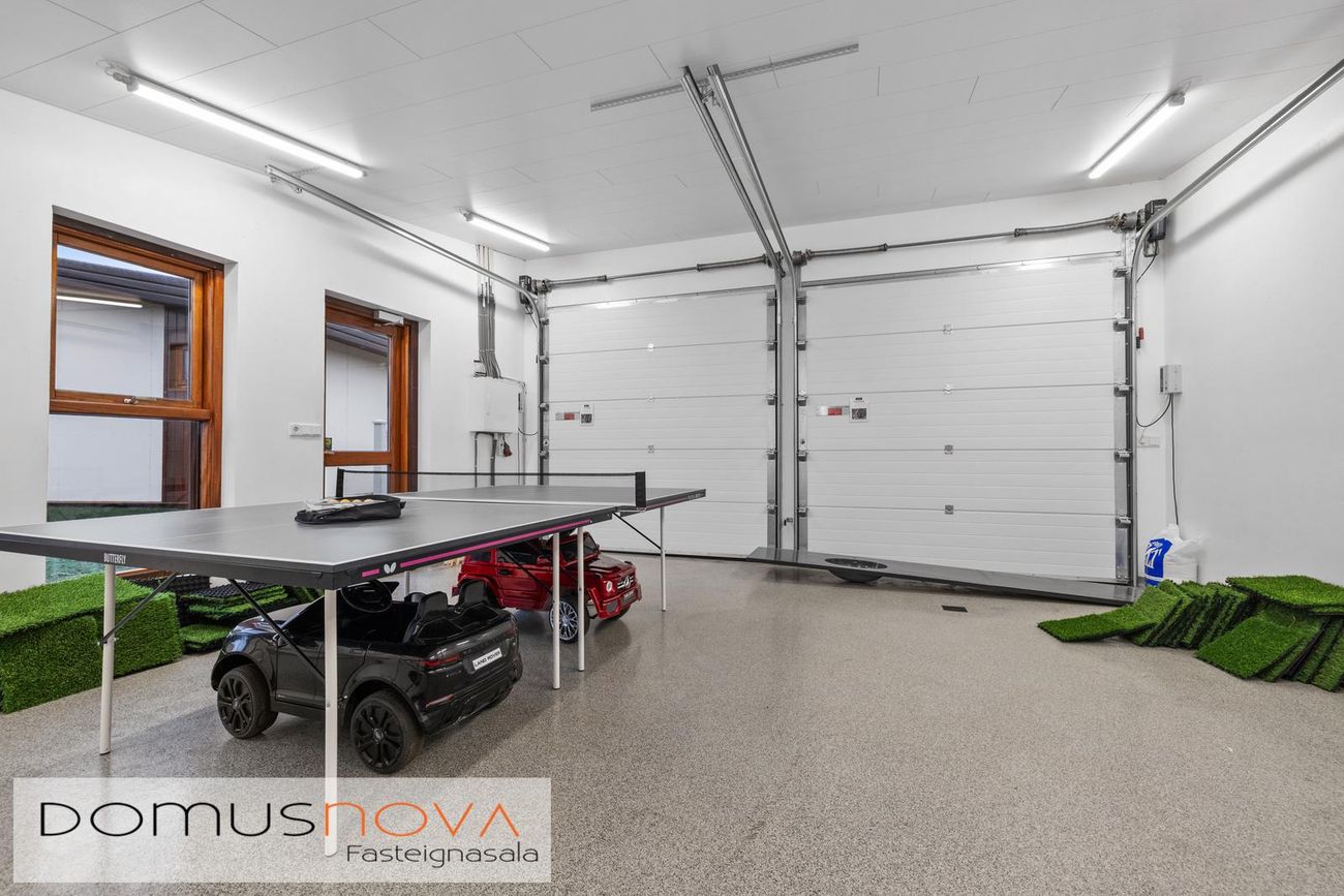 Bílskúr er tvöfaldur með mikilli lofthæð og tveimur stórum vönduðum innkeyrsluhurðum