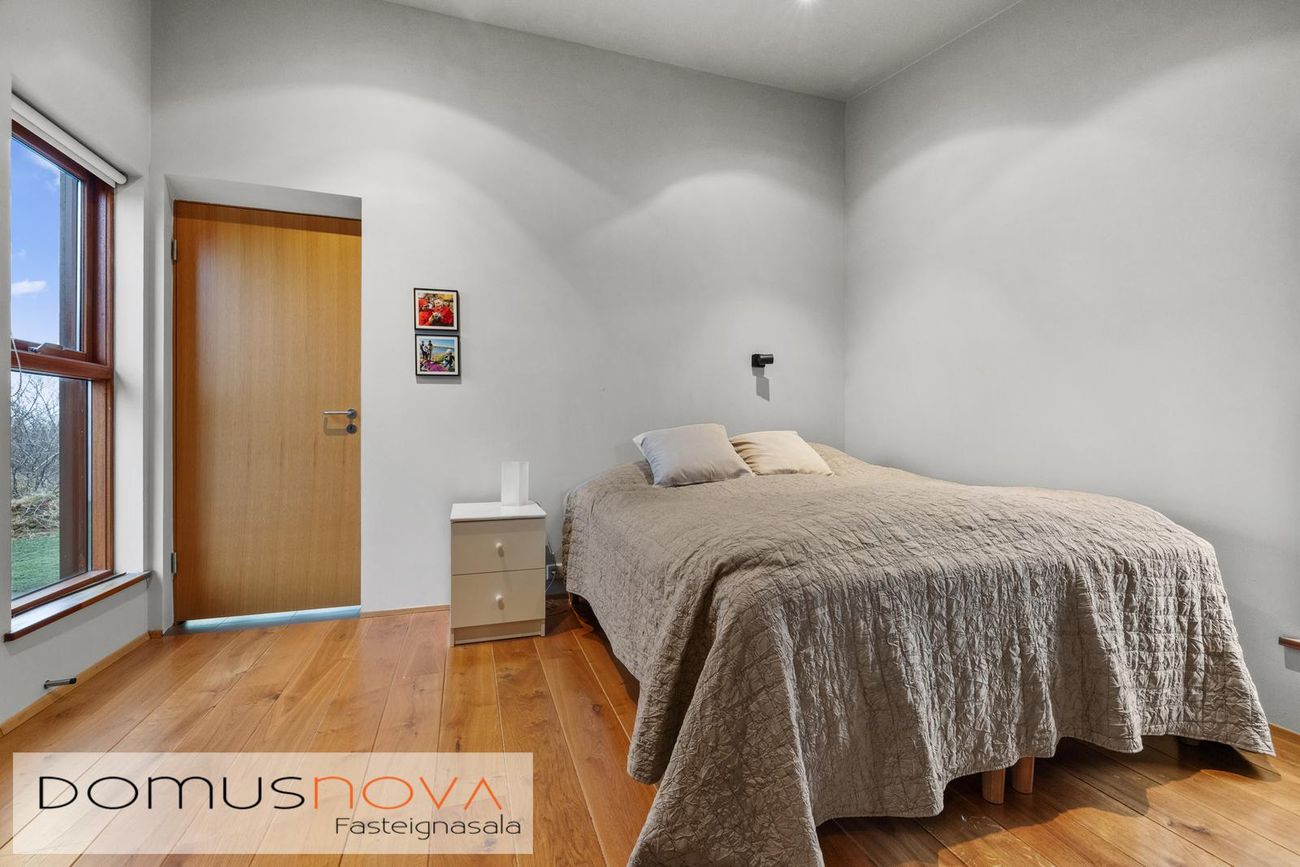 með rafdrifnum hurðaopnara. Á vesturhlið bílskúrs eru vandaðir harðviðargluggar með opnanlegum fögum og inngönguhurð með hurðapumpu.