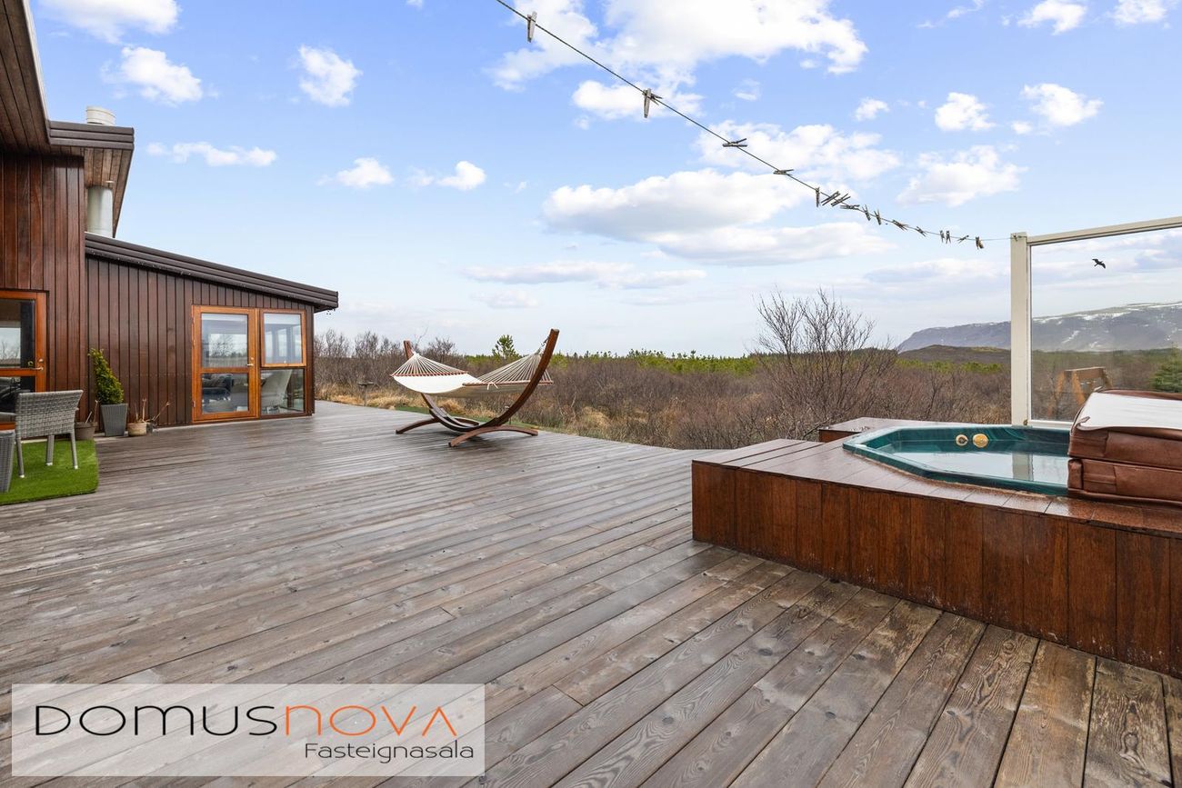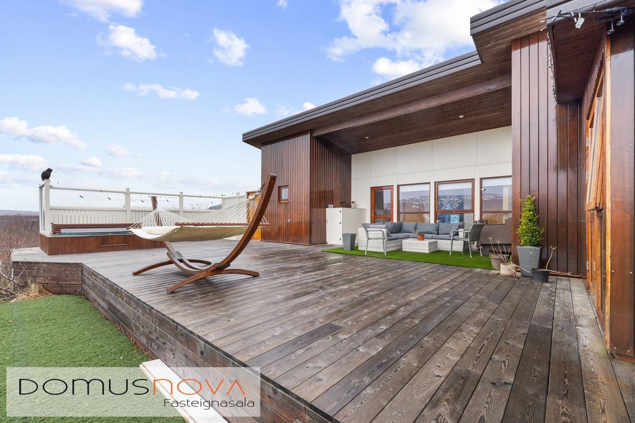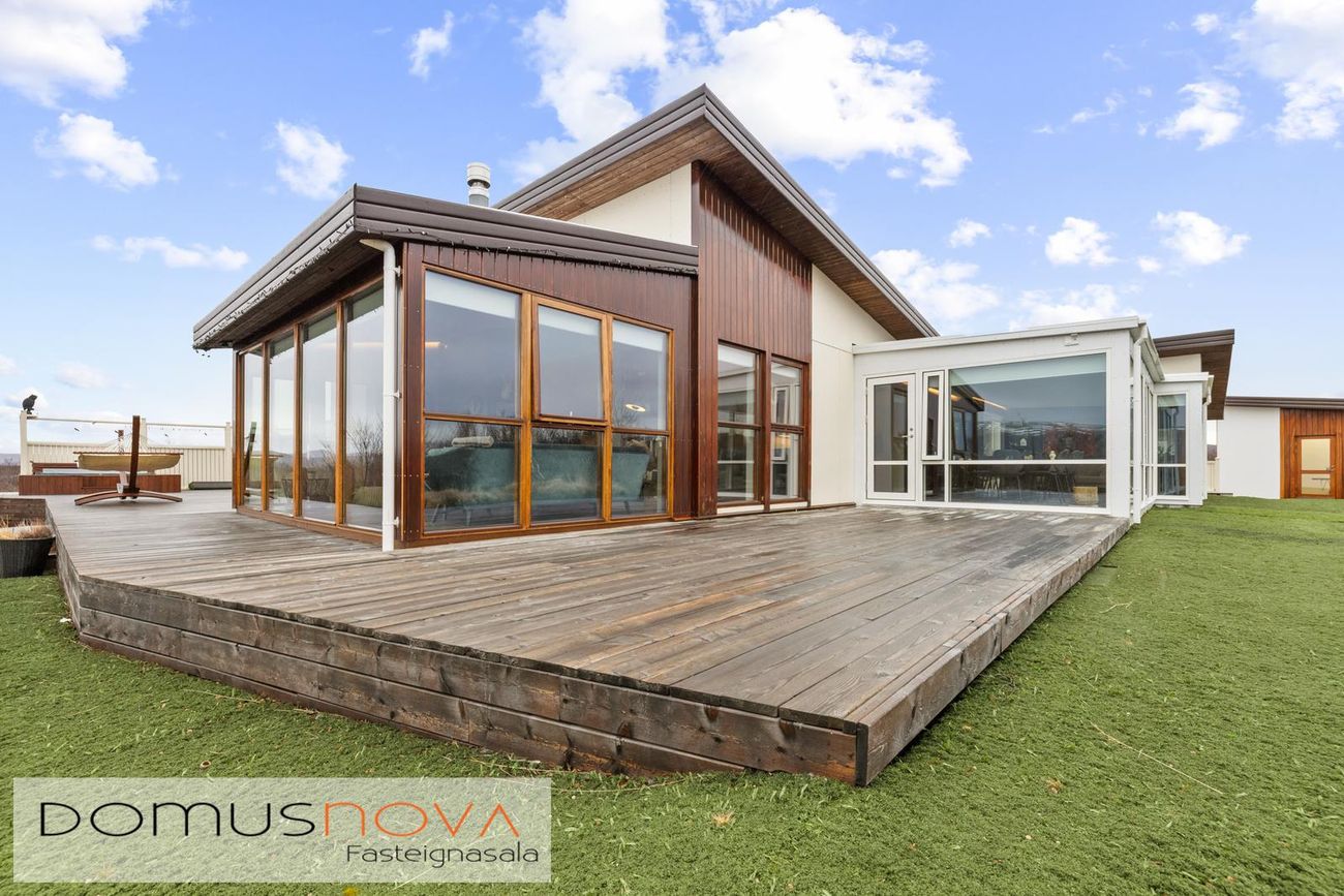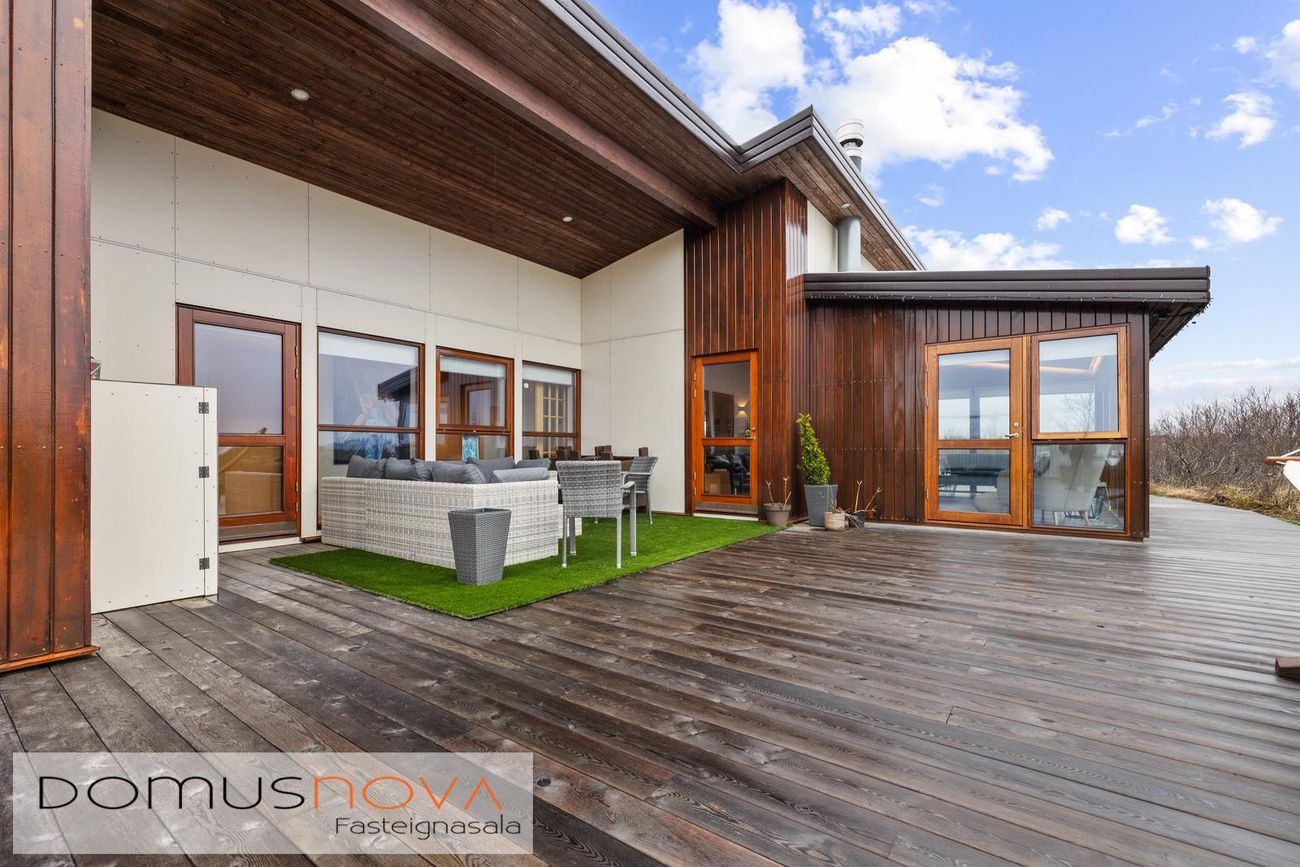 Eignin er reist úr timbri með aukinni þykkt i útveggjum og klædd viðhaldsléttum efnum á ytra birði, báðar klæðingagerðir eru harðviður (Jatoba viður og Duropal harðpressaðar plötur). Allir gluggar eru einnig úr harðvið. Stór verönd, u.þ.b. 200fm, er úr harðvið (Lerki). Vandaðir skjólveggir eru hringinn í kringum húsið, en þó ekki að sunnan og vestanverðu, þannig er hægt að njóta útsýnis úr gólfsíðum gluggum eignarinnar á alla náttúru og landslag sem við blasir. Vandaður heitur pottur með hitastýringu er frá framleiðandanum Trefjar.